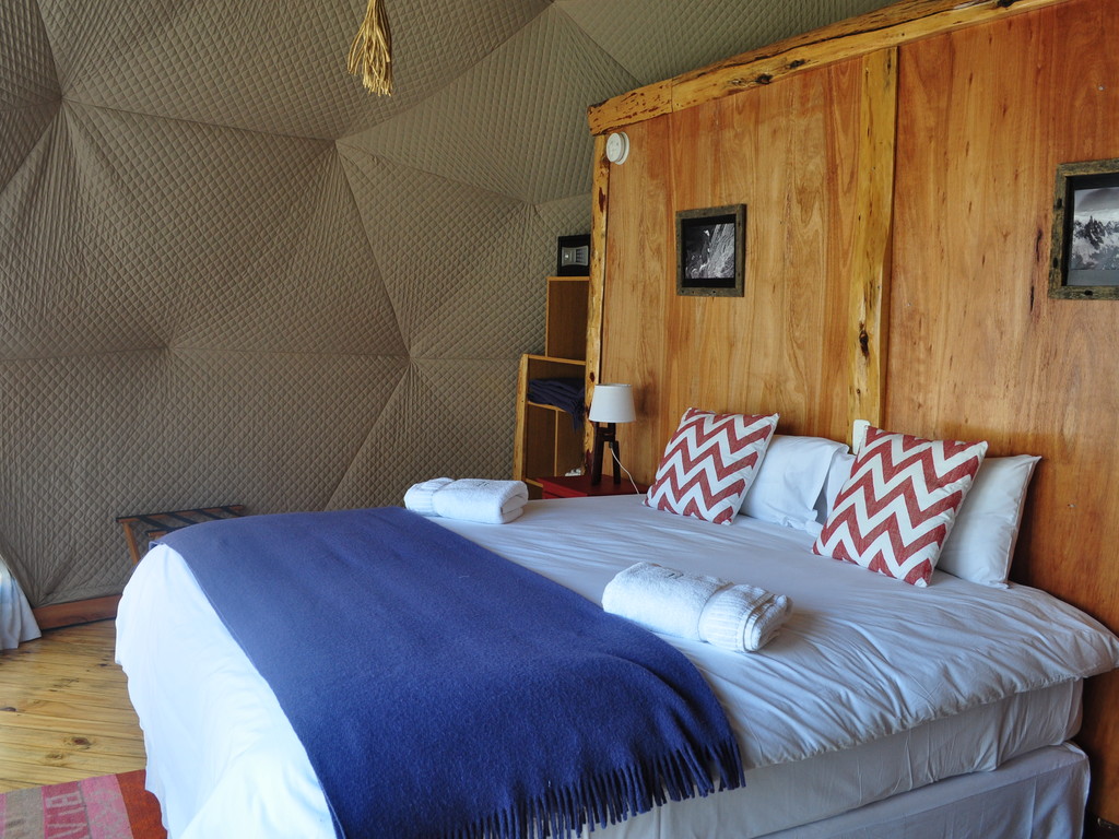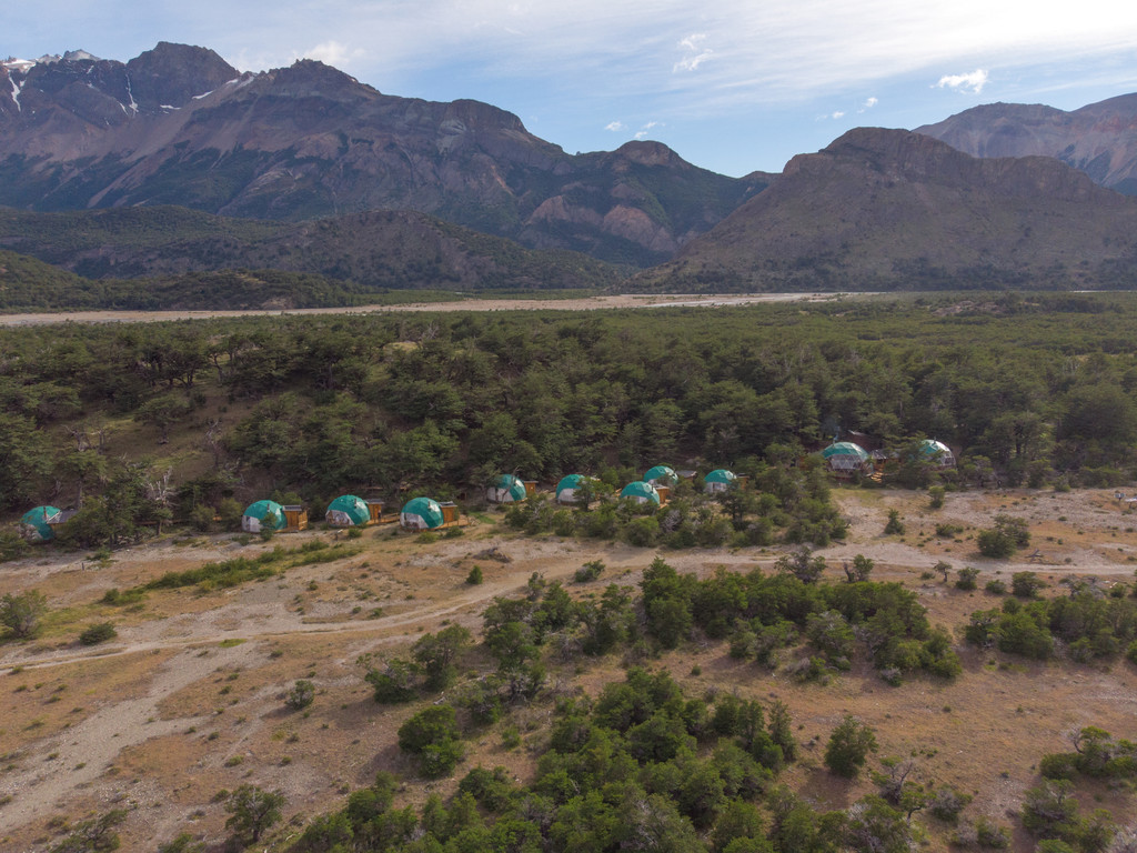 Patagonia Eco Domes offers upscale camping in first class geodesic domes. With their location near Los Glaciares National Park, small footprint, and tasteful construction, these private domes are a unique and comfortable lodging option. The site offers a great view of Mount Fitz Roy and private access to the Laguna de los Tres trail. Each of the seven domes has a private bathroom and woodstove and is powered by solar panels. The community dome has a restaurant and lounge area. Accommodations are rustic (the site is isolated and there is no internet or cellular service) but very well located and an excellent option for travelers who want to disconnect and enjoy nature.