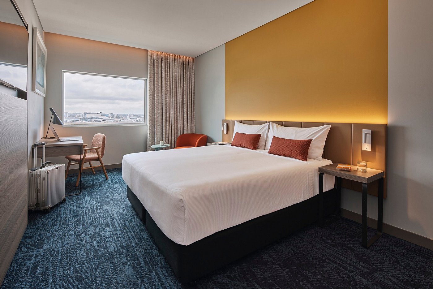 Rydges Sydney Airport is a modern hotel located directly opposite the international terminal, offering convenient, walkable access for travelers. The hotel features soundproofed rooms with contemporary furnishings, blackout curtains, and in-room flight information screens. On-site amenities include a 24-hour reception, gym, business facilities, and several dining options including a bar with runway views. With its location, efficiency, and practical comforts, Rydges is well-suited for overnight stays, early departures, or transit through Sydney.