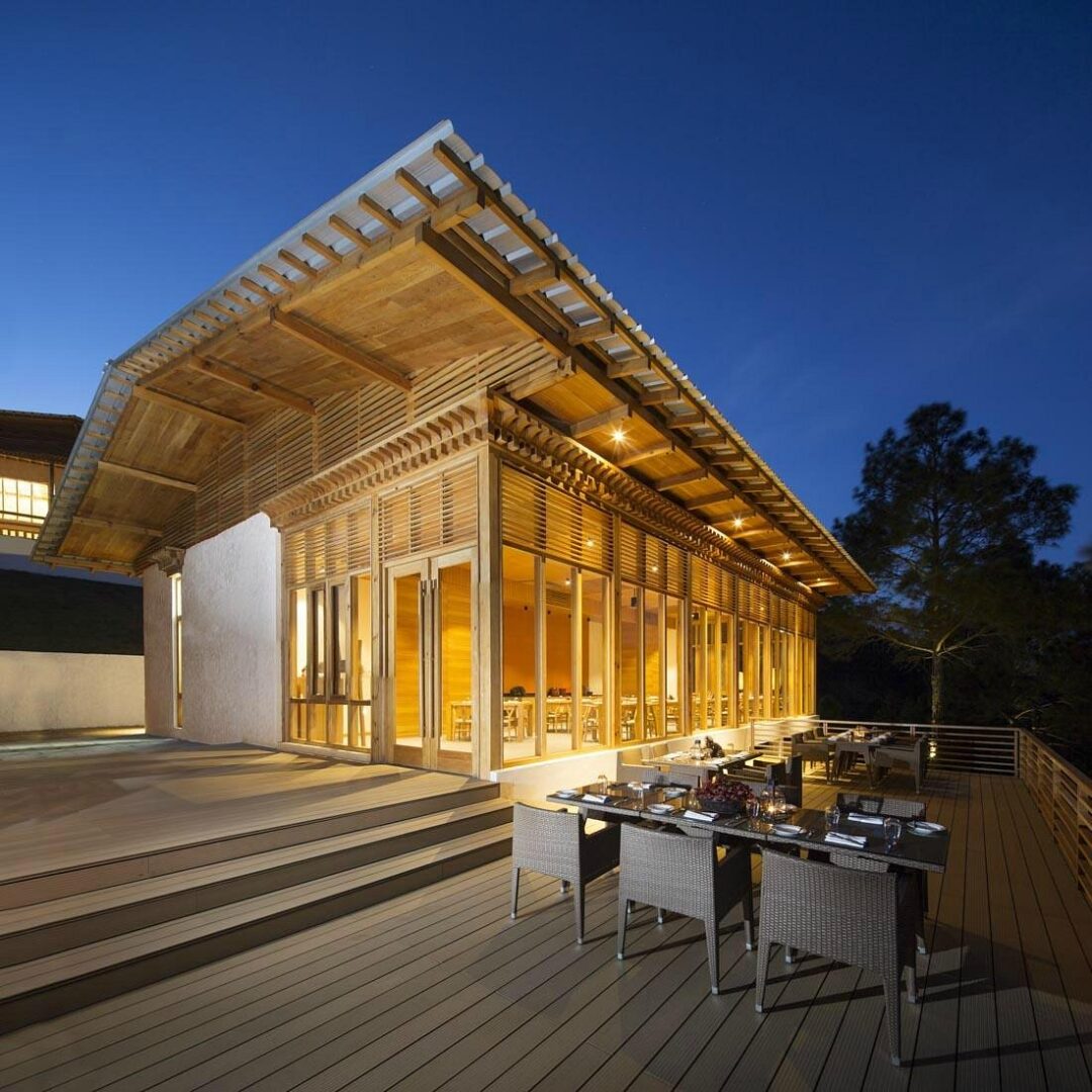 Dhensa Resort sits in the heart of the tranquil and lush Punakha Valley. Flanked by thick pine forests, it overlooks the Punakha river and hundreds of paddy fields that stair-step down to the valley floor. The 24 contemporary and bright suites are set in six cottages, all with private balconies, plush beds, and bathtubs thoughtfully set by French windows. The restaurant serves home-style Bhutanese cooking, as well as a variety of Western and Asian favorites, and are created using local and organic produce. There's also a spa offering an array of massage treatments, and a yoga shala.