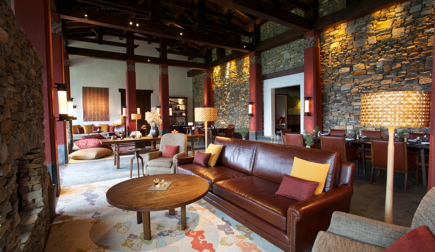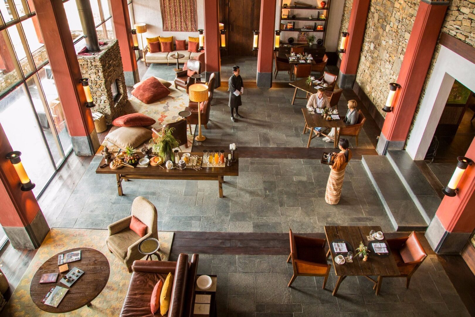 This award-winning 5-star lodge is perched high above the pristine nature reserve of Bhutan's Phobjikha valley. Stay in Bhutanese-style farmhouse suites, all equipped with cozy fireplaces, clawfoot tubs, sweeping views, underfloor heating, spacious living areas, Wifi, climate control, luxurious toiletries and linens, and more. Dine on modern Bhutanese cuisine on private picnics or in the restaurant, featuring two enormous stone fireplaces, and unwind in the spa with a massage or dip in a hot stone bath.
