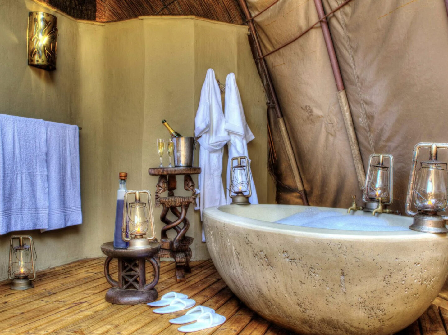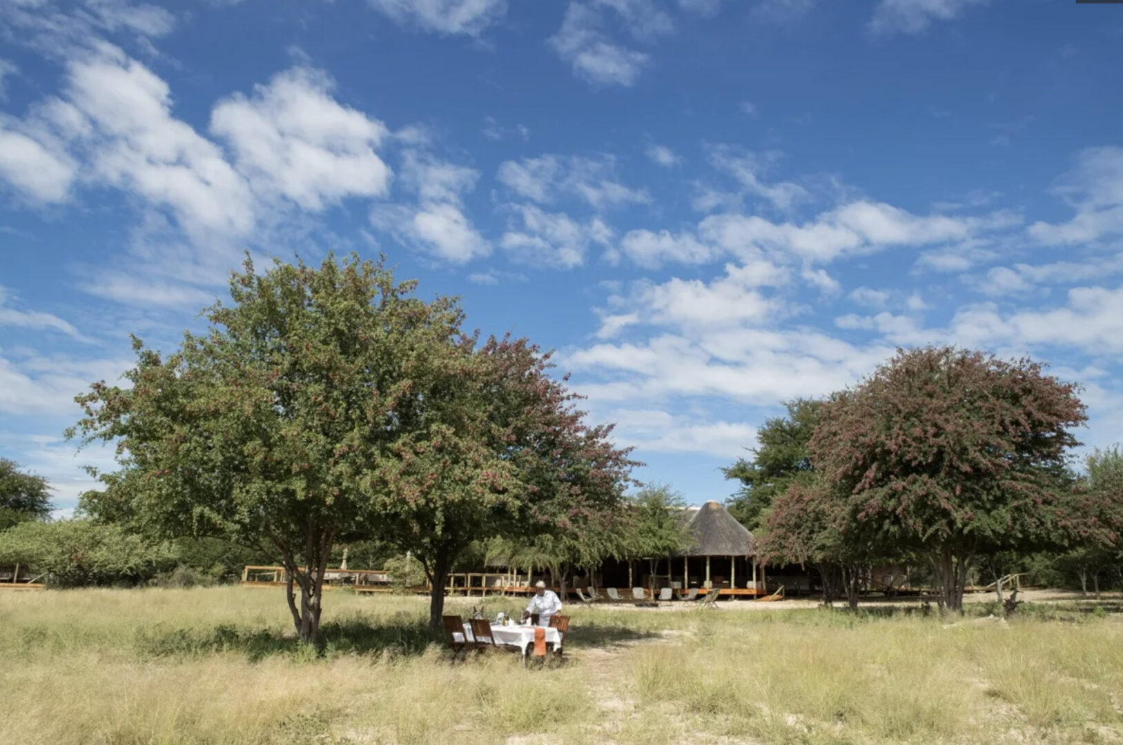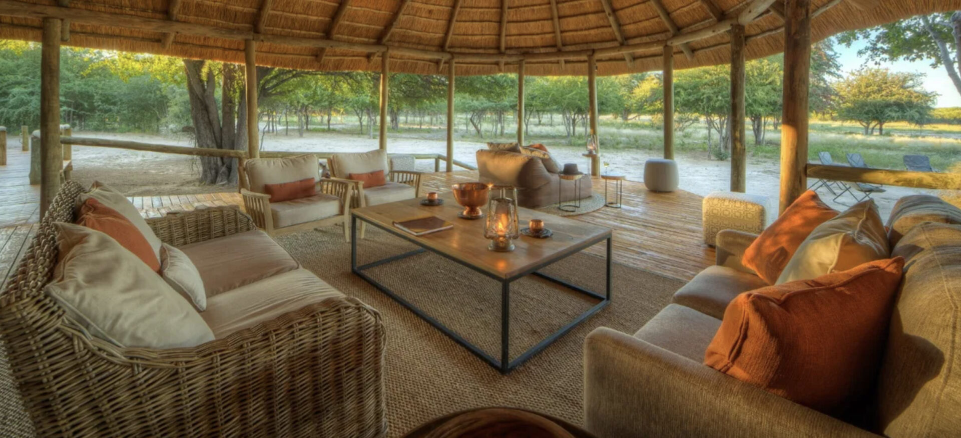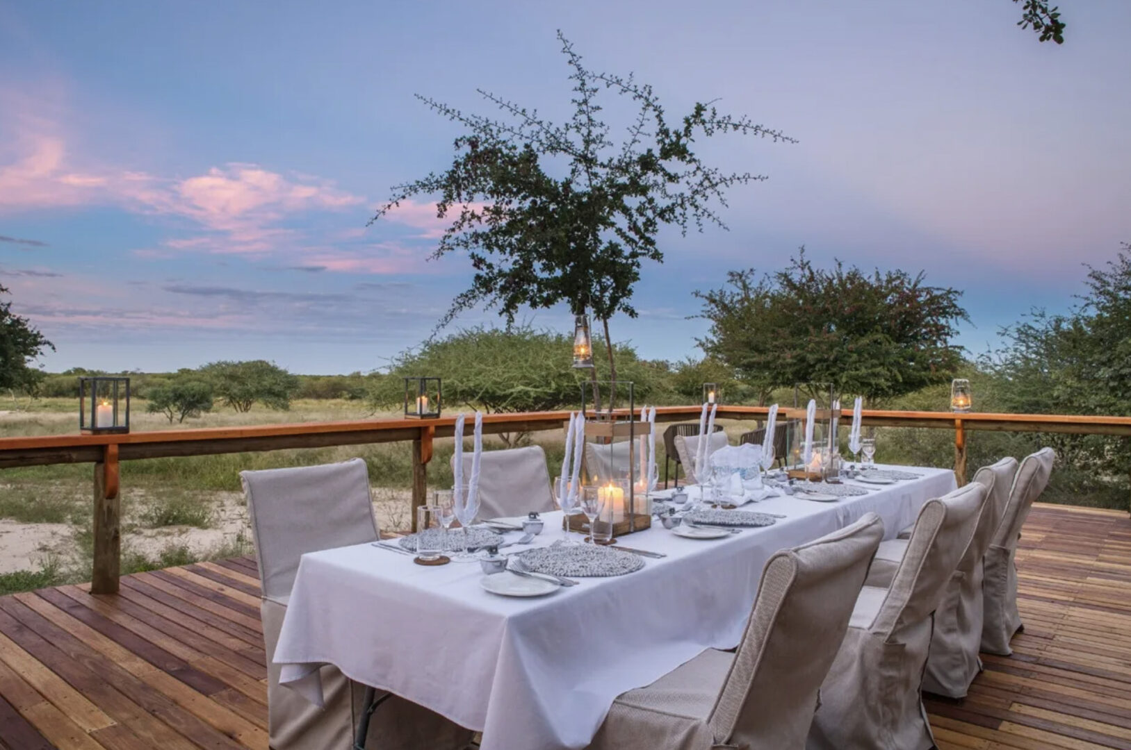 This 5-star lodge is located in a private conservancy hugging the northern edge of the Central Kalahari Game Reserve. Guests are accommodated in seven spacious twin and double-bedded safari tents, each en-suite bathroom has an indoor and outdoor shower, hot and cold running water and flush toilet. Families are accommodated in a two-bedroomed tent, sharing a spacious en-suite bathroom – ideal for families in this child-friendly camp. Dinaka’s tents are well spaced and raised up on wooden decks giving the perfect vantage point over a permanent water hole.