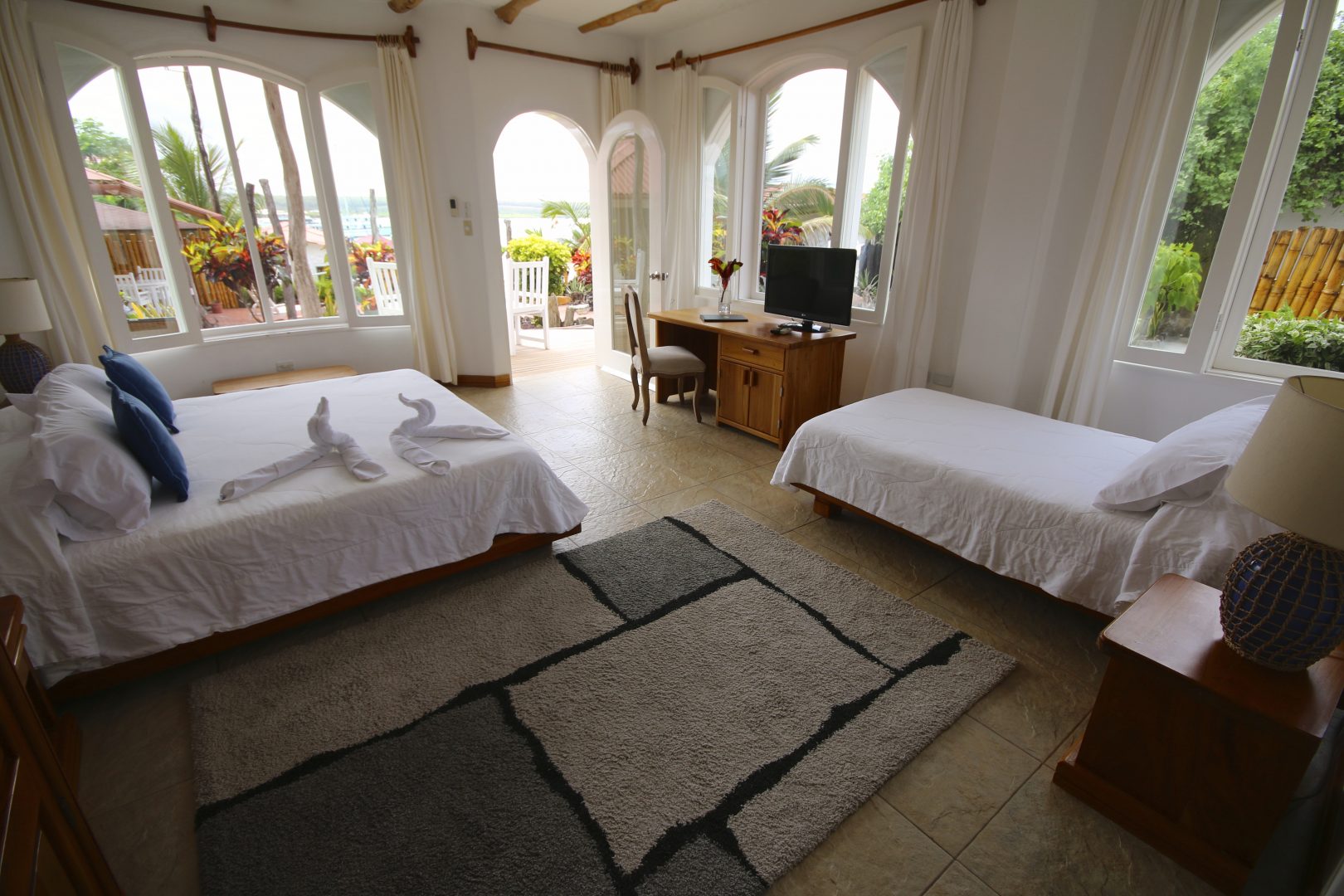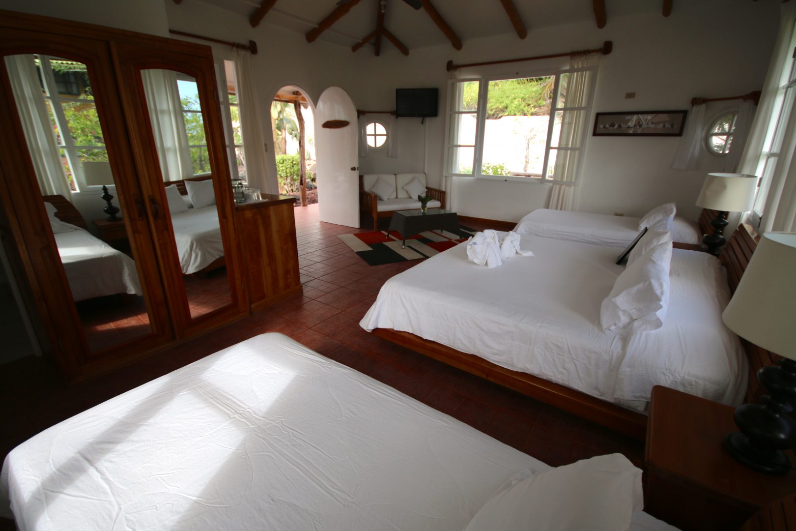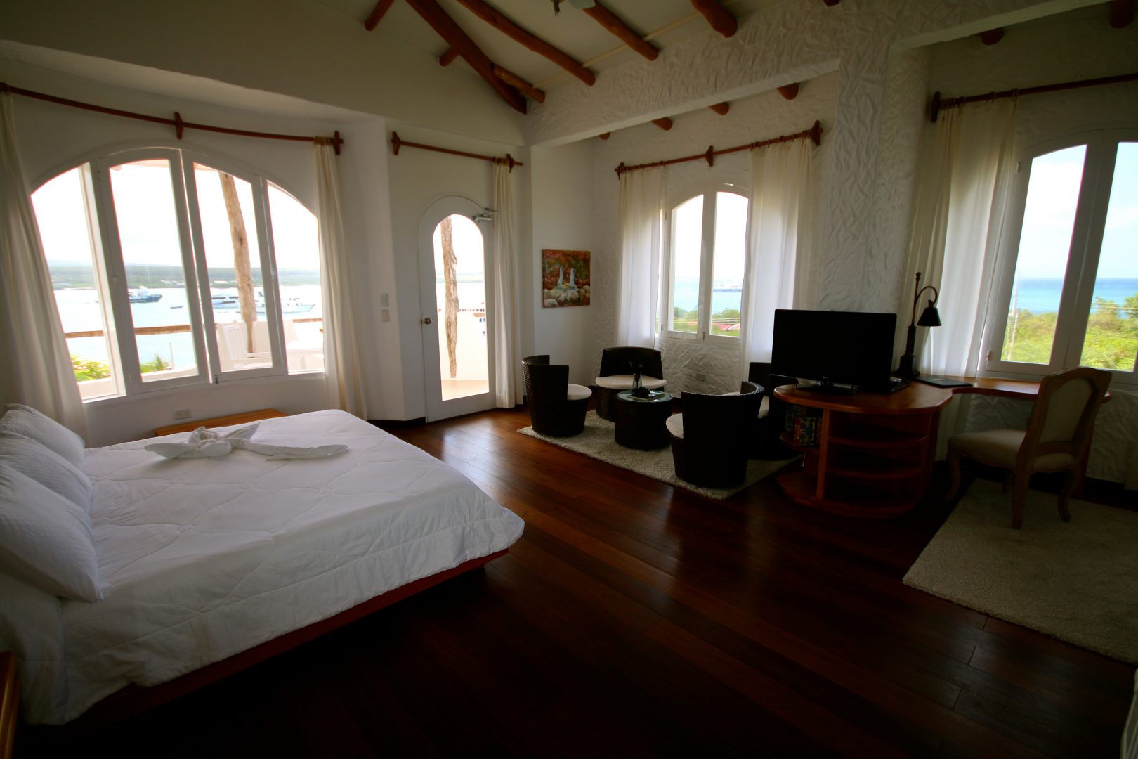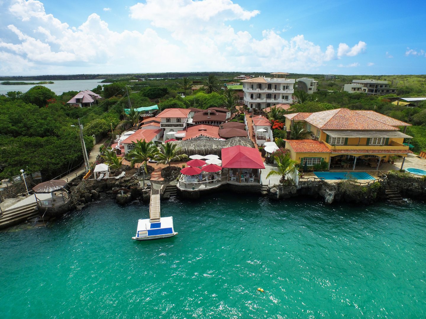 Constructed of local materials such as lava rocks and driftwood, the Angermeyer Waterfront Inn sits on the waterfront in the area known as “Punta Estrada,” just across the bay from Puerto Ayora. This historic hotel was constructed around the Angermeyer Cave, which once housed some of the earliest settlers of the Galapagos. The original Angermeyer Cave forms the Inn’s reception and lounge area, while two other buildings hold 16 rooms with different layouts. The hotel also offers water-side dining with exception views of the bay.