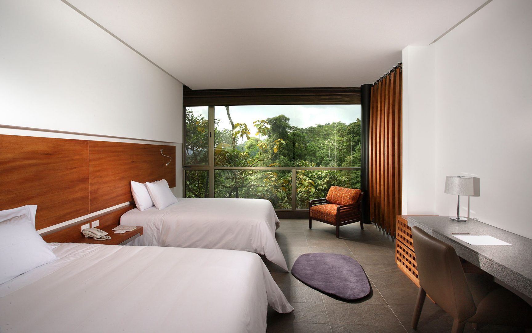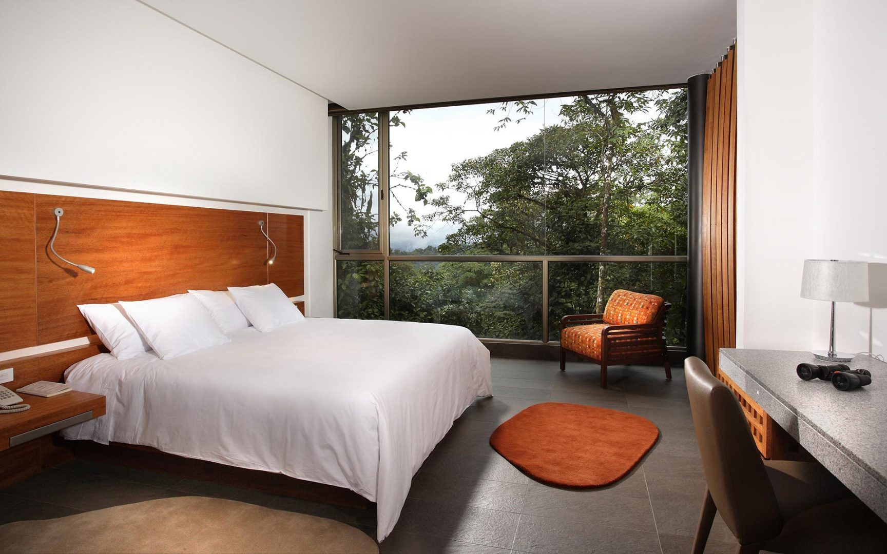 Situated high in the Andes on a plateau in Ecuador’s Mashpi Rainforest Biodiversity Reserve, Mashpi Lodge offers up-close views of the lush rainforest that surrounds it. The lodge is sophisticated and modern, built with the latest sustainability techniques and designed to blend beautifully with its surroundings. Each of the 22 rooms has floor-to-ceiling windows overlooking the jungle, as does the 2-story dining room, which features gourmet Ecuadorian-fusion cuisine.