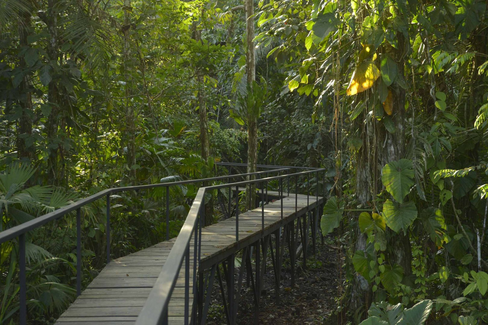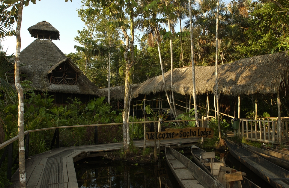 Access The journey to Sacha Jungle Lodge is scenic and adventurous. From Quito you take a brief 30-minute flight over the snowcapped Andes Mountains to the jungle port city of Coca. Here, you will be met by one of the lodge's bilingual guides, who will transfer you to a private dock to board a motorized canoe for your 2-hour journey down the Napo River, the largest river in the Ecuadorian Amazon. During the ride along the river you will likely see a variety of shorebirds among the scattered native huts, including herons, kingfishers, and osprey. Upon arrival to Sacha Lodge's private dock, the lodge staff will take your luggage and lead you on a walk along a raised boardwalk through dense flooded palm forest, where several species of monkeys are often sighted. The path leads to Pilchicocha Lake, a blackwater rainforest lake where dugout paddle canoes are waiting to carry you on the last part of the journey to the lodge on the opposite shore.