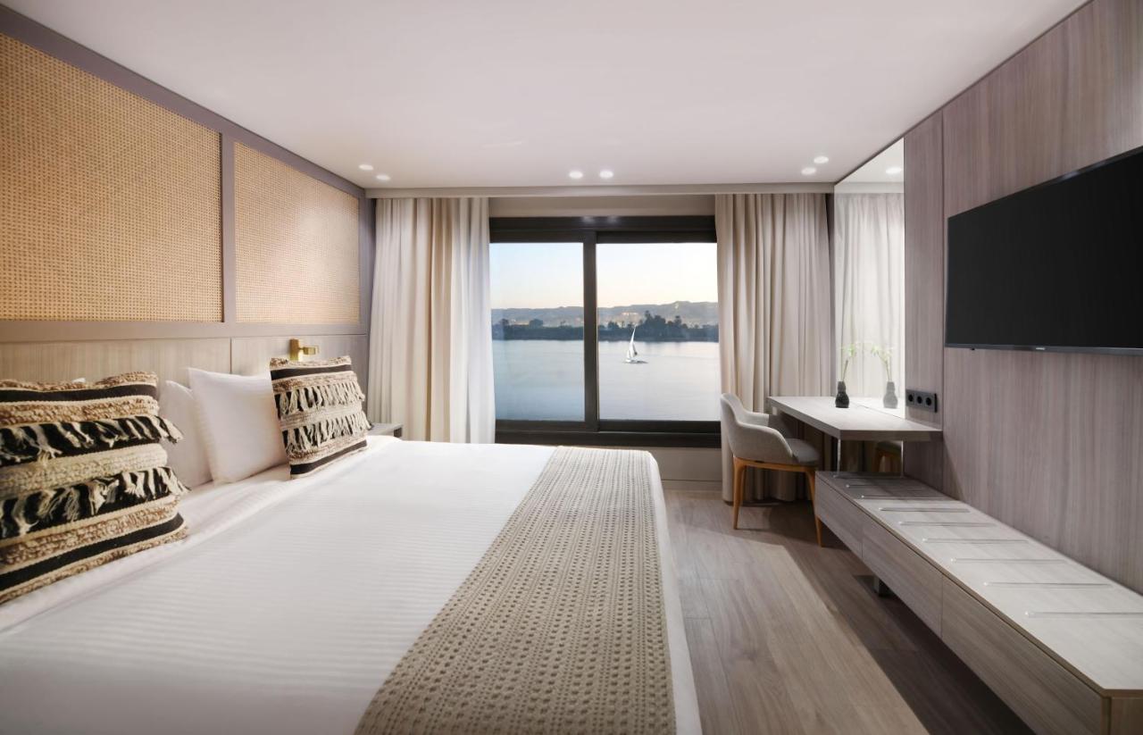 The Historia cruise embraces stylish comfort. With Egyptian-inspired furniture throughout, this 5-star cruise draws on the heritage of the land, with perforated rattan screens to allow an interplay of light and shadow and give a soft, diffuse glow to the luxurious surroundings. Take in the sights and sounds of life along the Nile and soak in the sun rays aboard the Historia’s solaria deck. Enjoying uninterrupted view from the luxury of the ship’s swimming pool is the perfect way to cool off after a day of exploring historical sites. A wide range of suites are available, each outfitted with luxe amenities to ensure a comfortable stay. Onboard there's a bar, lounge, and restaurant, as well as a gym and spa.