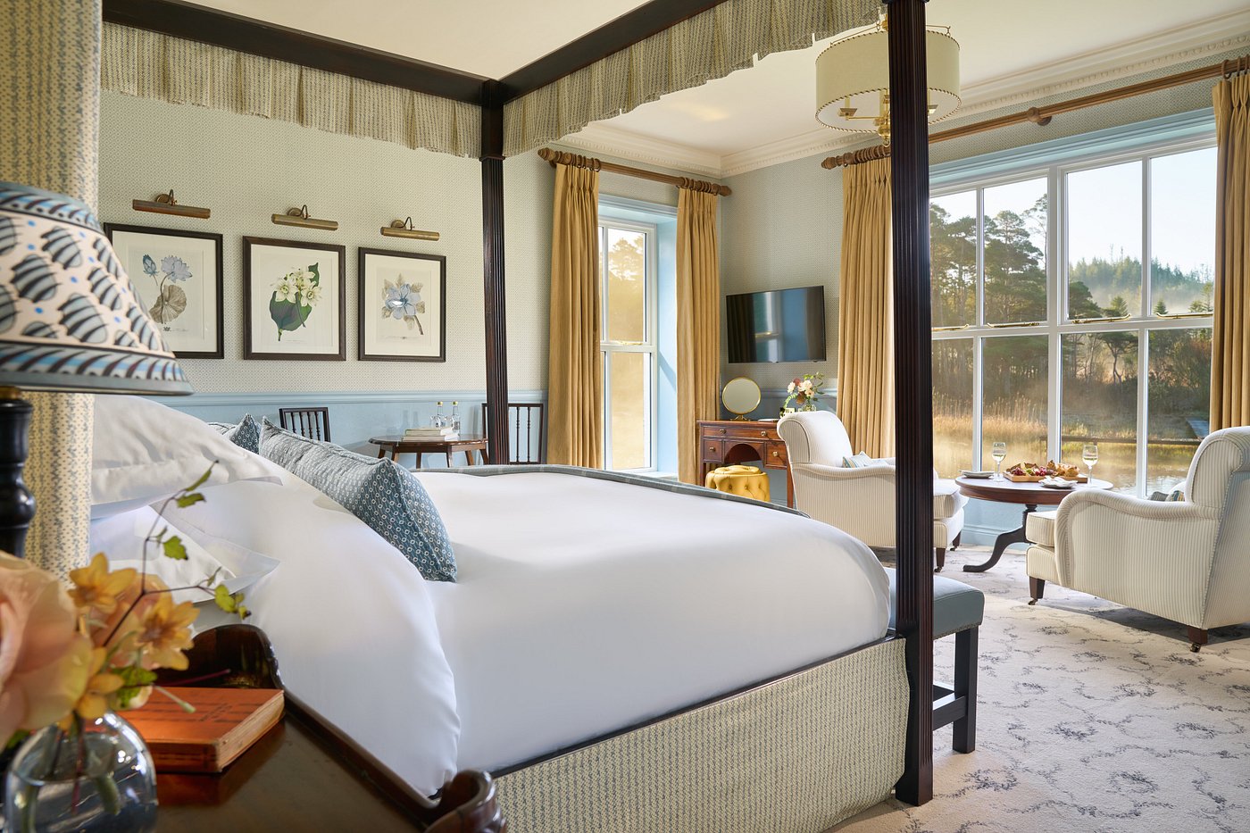 Set on a 700-acre estate in Connemara, Ballynahinch Castle Hotel is an 18th-century castle overlooking the Ballynahinch River. The property offers 48 rooms and suites, many with river or woodland views, furnished in a country-house style with modern comforts. The Owenmore Restaurant highlights seasonal Irish produce, while the Fisherman’s Pub provides a more casual setting with open fires and traditional atmosphere. Interiors feature antiques, wood-paneled rooms, and historic details that reflect the castle’s long heritage.