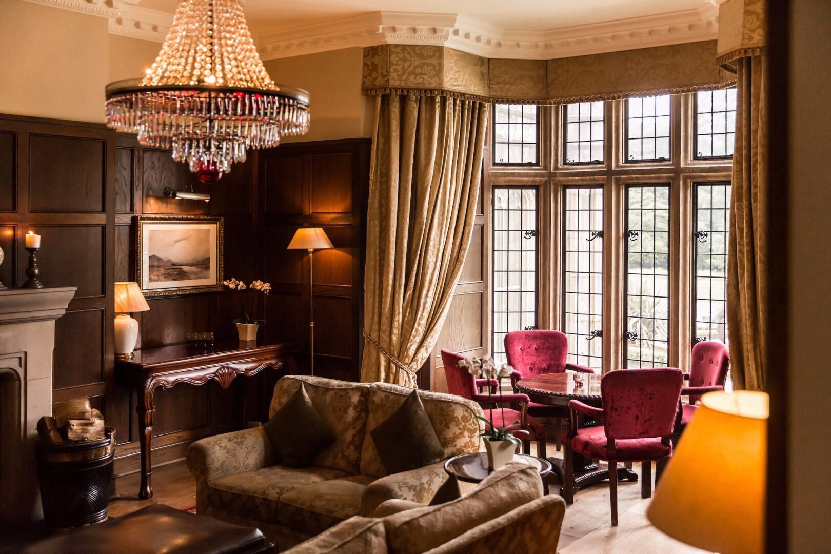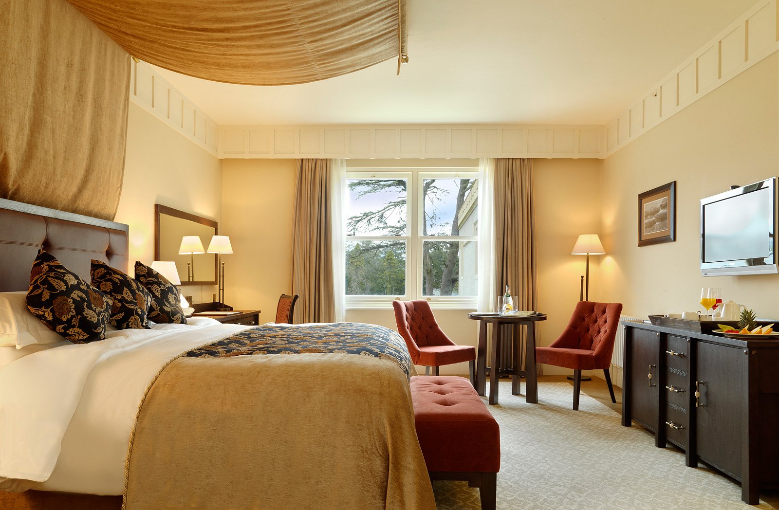 Set on a lakeside estate at the foot of the Bluestack Mountains, Lough Eske Castle is a restored 17th-century castle offering five-star accommodations in County Donegal. The property has 97 rooms and suites that combine historic architecture with contemporary comfort. Facilities include a fine-dining restaurant, a casual bar and grill, and a spa with an indoor pool and thermal suite. The estate grounds provide walking trails and access to nearby attractions such as Donegal Town, Slieve League cliffs, and Glenveagh National Park.