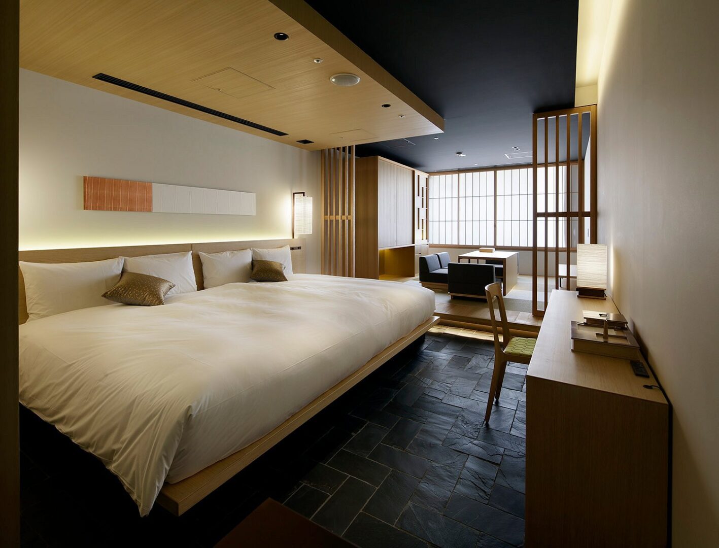 Located a 12 minute walk from Kyoto Station, Hotel Kanra Kyoto is a lovely hotel outside of the hustle and bustle of central Kyoto. The decor is a modern Machiya style, built with natural materials such as wood, stone, and iron, and crafted with traditional skills and techniques from Kyoto. The 68 rooms and suites are in a Japanese and Western style and include all modern necessities. Beds range in size from full to extra wide king beds, and some rooms and suites have a spacious outdoor bath made of cypress set in a Japanese garden on a terrace. Unwind in the cedar soaking tubs, dine at the restaurant featuring items from wagyu steak to wood-fired pizza, or relax in the spa.