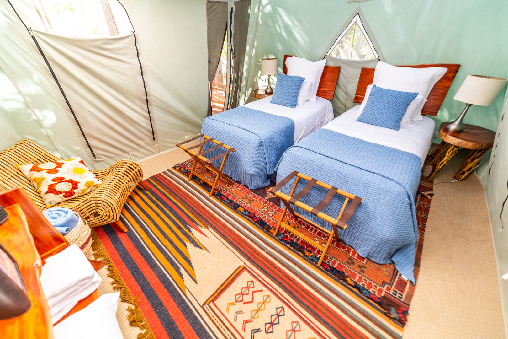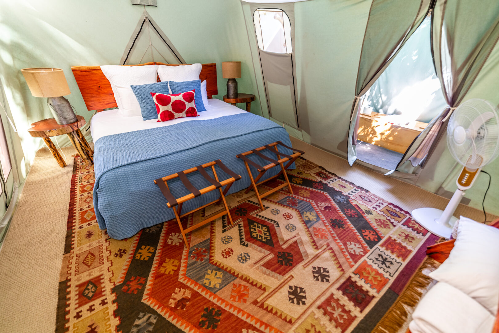 The accommodations are beautifully decorated walk-in tents with real beds, linens, rugs, bedside tables, lamps, mirrors, chairs, towels, and rocking chairs on the patio. Each tent has a private compost toilet cabaña, and there is a shared shower cabaña. Activities include beautiful hikes in the reserve with spectacular views, swimming in watering holes and picnicking by waterfalls. There is fantastic birding in the mornings, and amazing star gazing at night.