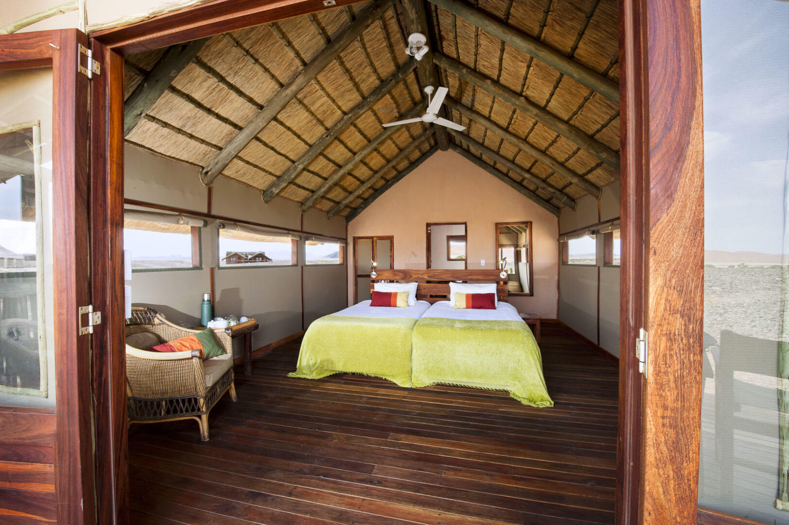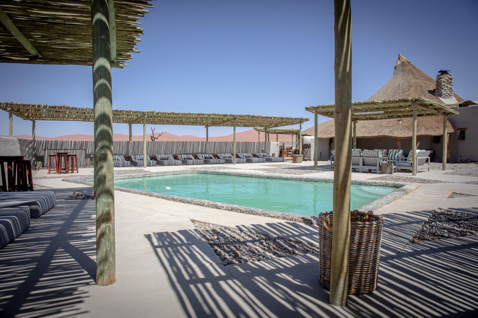 Kulala Desert Lodge is situated at the foot of the majestic Sossusvlei Dunes and is the closest hotel to Sossusvlei itself, accessed through a private gate. The camp comprises 23 thatched and canvas tents (including two family units), each built on a raised wooden platform, with a rooftop area for sleep-outs under the stars. The main area includes a pool and wraparound veranda overlooking a waterhole.