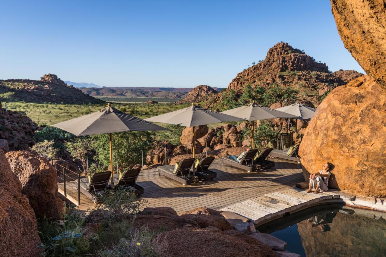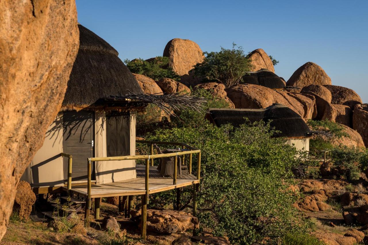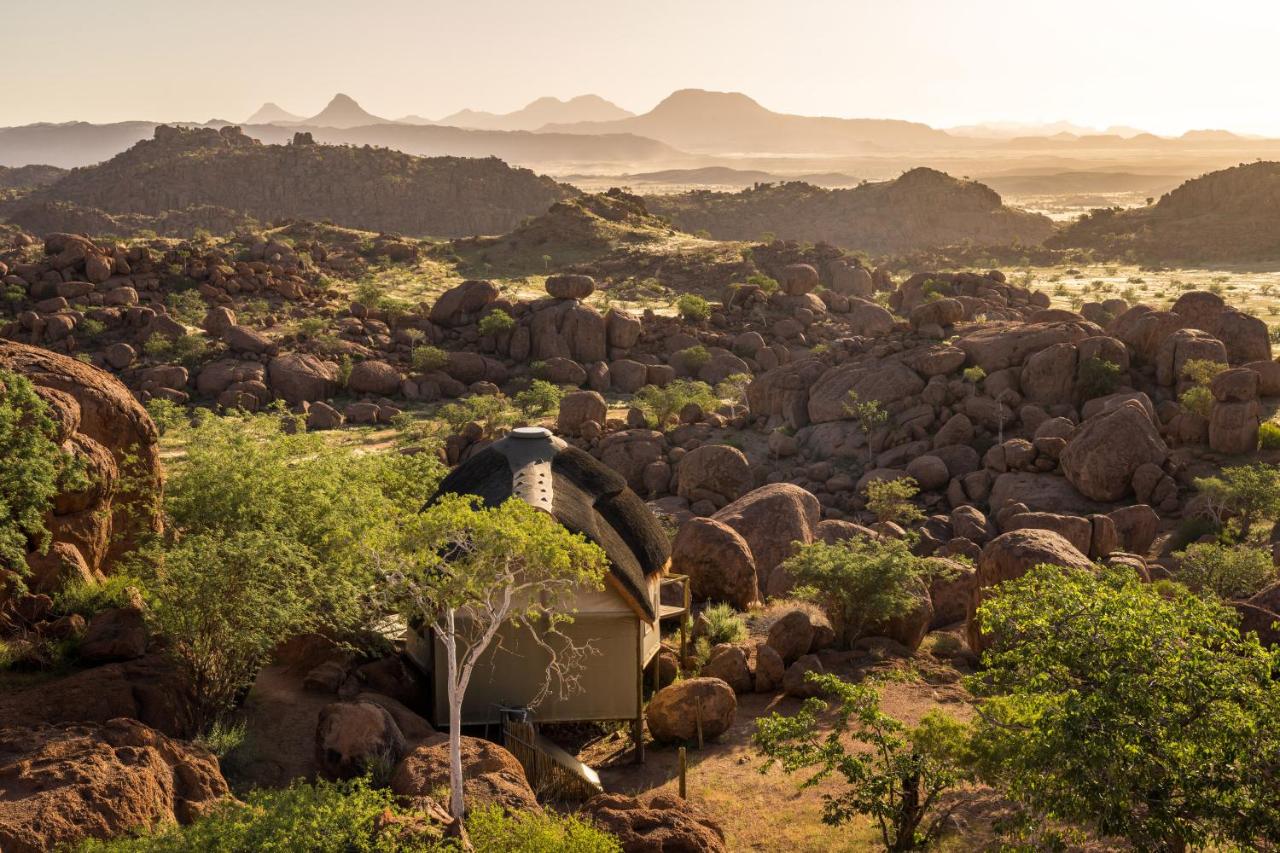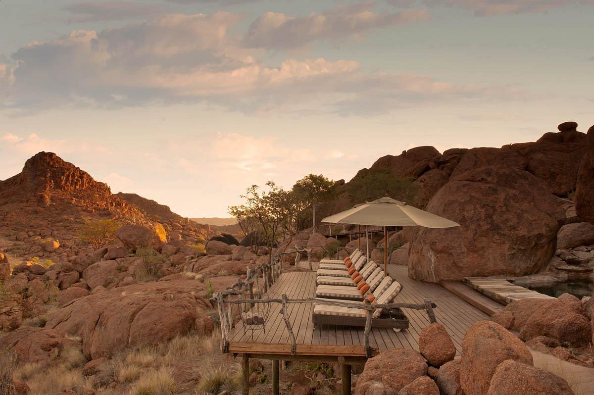 Mowani Mountain Camp is set among the stunning landscapes of Damaraland. Dwarfed by massive ochre boulders, the camp blends beautifully into the landscape. Each of the luxury tented suites offers magnificent desert views, open-air en suite bathrooms, and private decks that allow tranquil privacy and incredible stargazing.