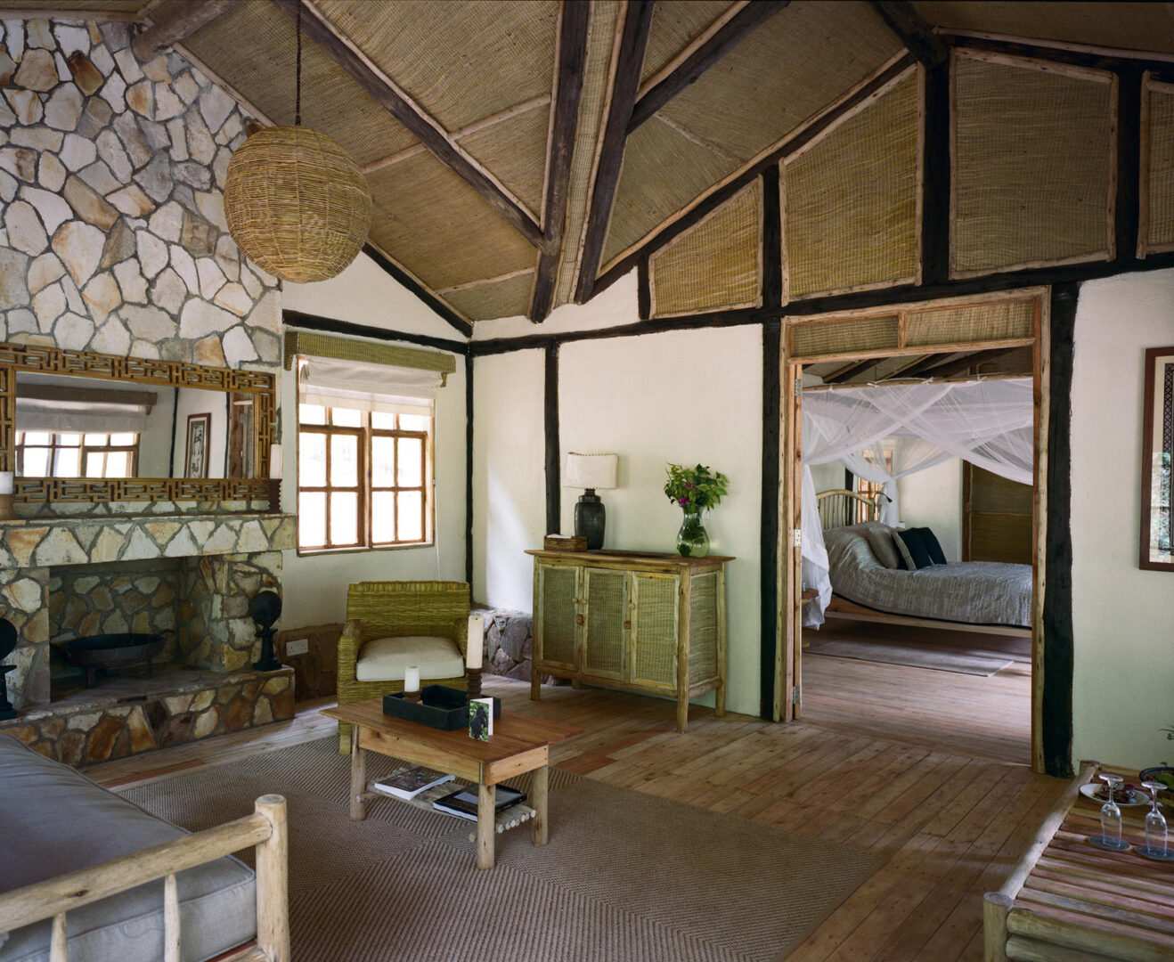 The eight individual cottages each have their own view of the forest, have been styled with warm luxurious interiors, inviting four poster beds and locally-inspired furniture.