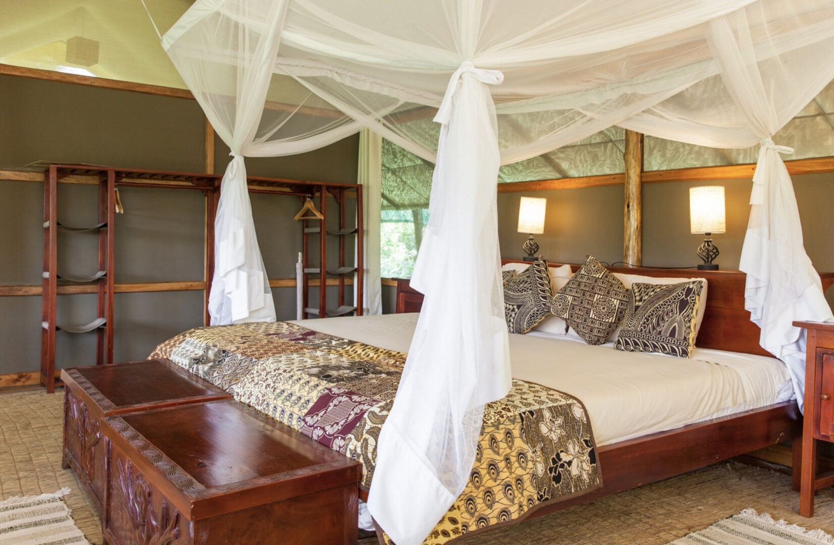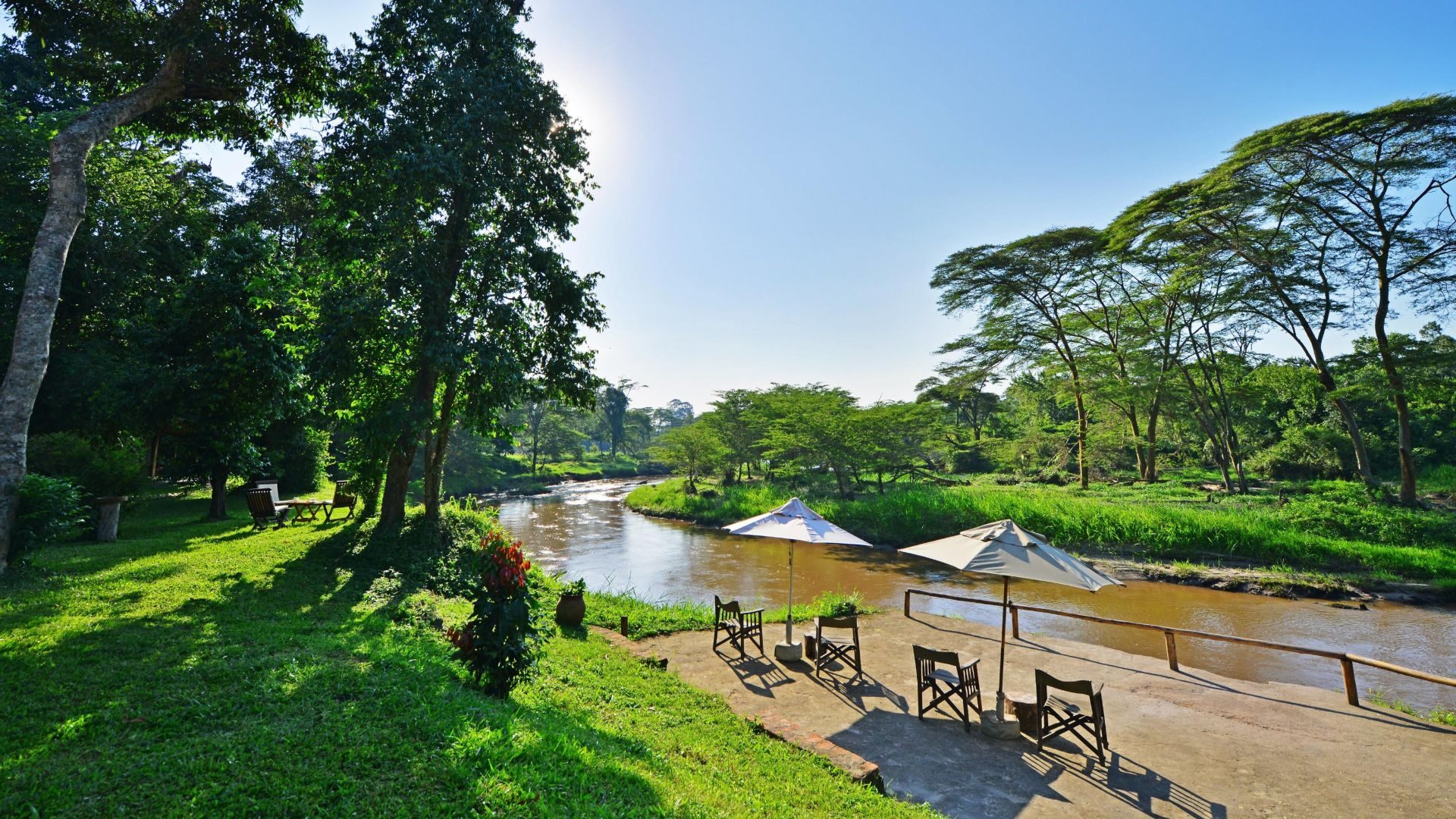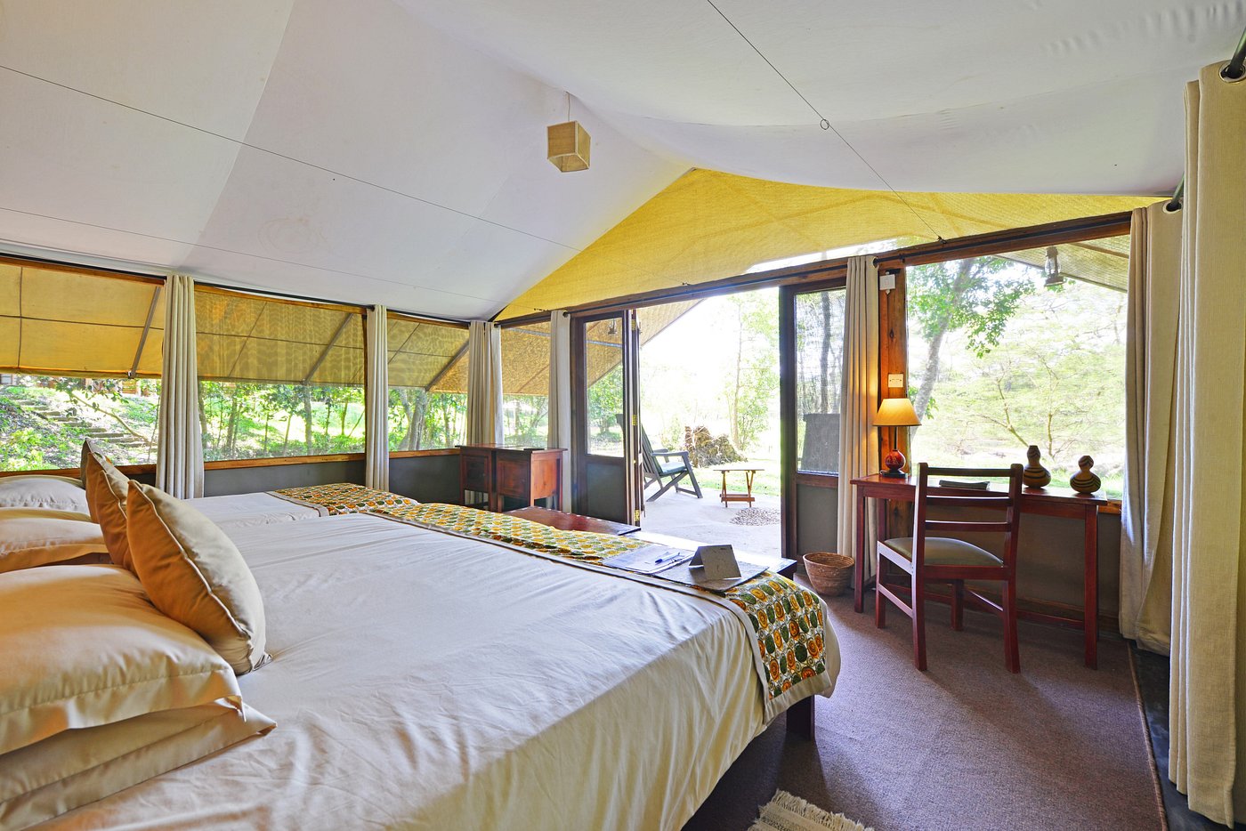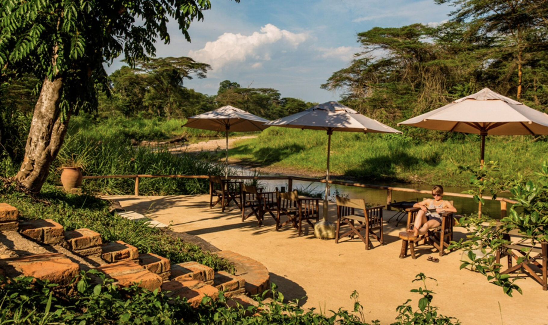 Sitting in on the Ntungwe River in one of the more secluded areas of Queen Elizabeth National Park, Ishasha Wilderness Camp is a beautiful eco-lodge that blends seamlessly into its untamed surroundings. This peaceful retreat features ten expansive tents that provide an authentic haven in the wilderness, and all have private verandas with views overlooking the river. The lodge features a spacious thatched lounge, and meals are served either in the cozy dining area or al fresco on the banks of the river. In the evening, guests can enjoy a communal campfire near the well-stocked bar.