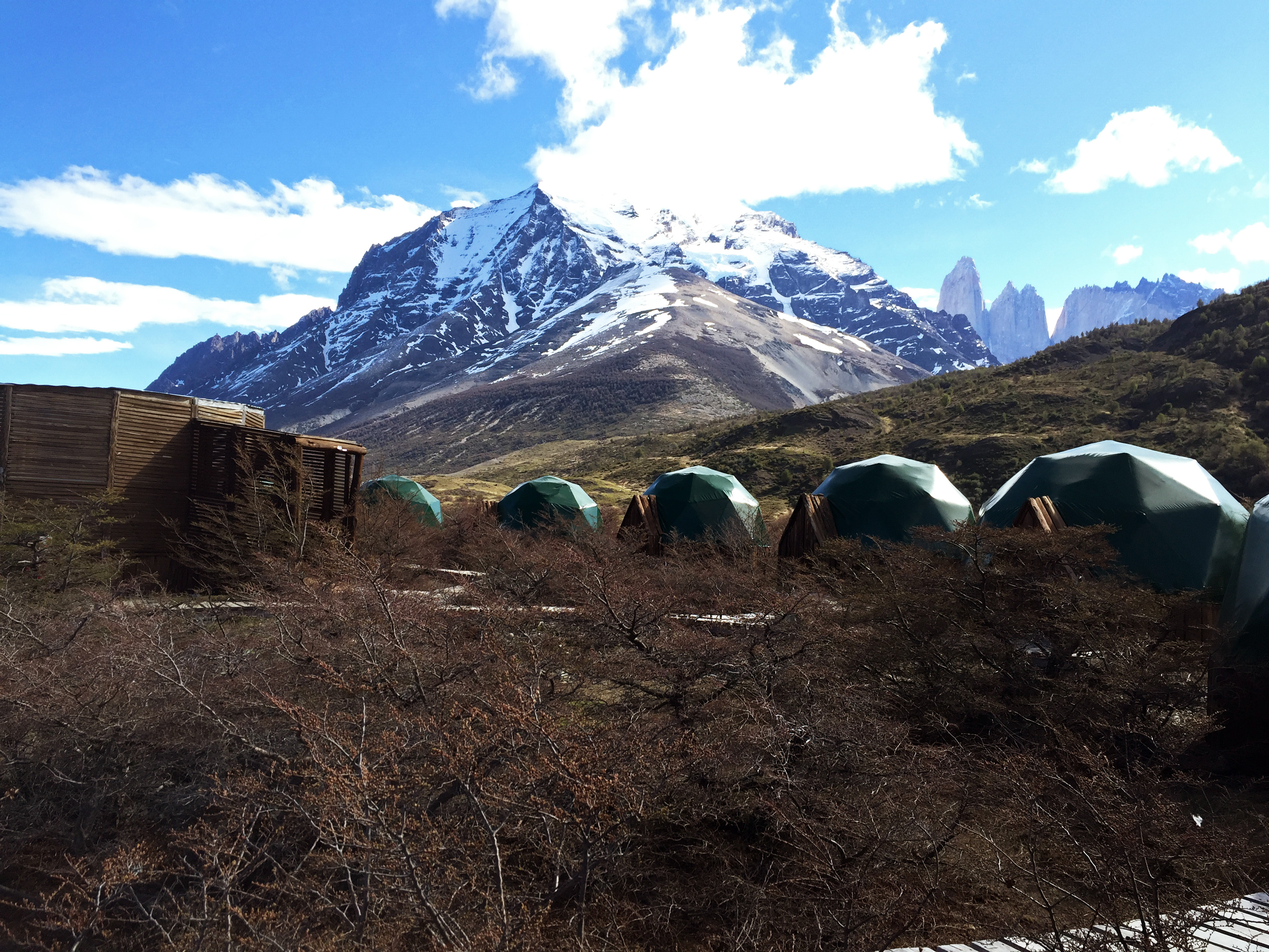 Lodging: My Suite Dome was spacious and comfortable, with a private bathroom with shower. The domes are equipped with a wood stove that is lit each evening while guests are at dinner, making the place snug and cozy by bedtime. The domes are also equipped with tea and coffee, and a large thermos of hot water is provided upon request. The domes have electricity, though guests are requested not to charge anything larger than cell phones and cameras to avoid taxing the electrical system. All of the Suite Domes have a small private porch, and several of them offer views up to the Paine Towers from which the park derives its name.