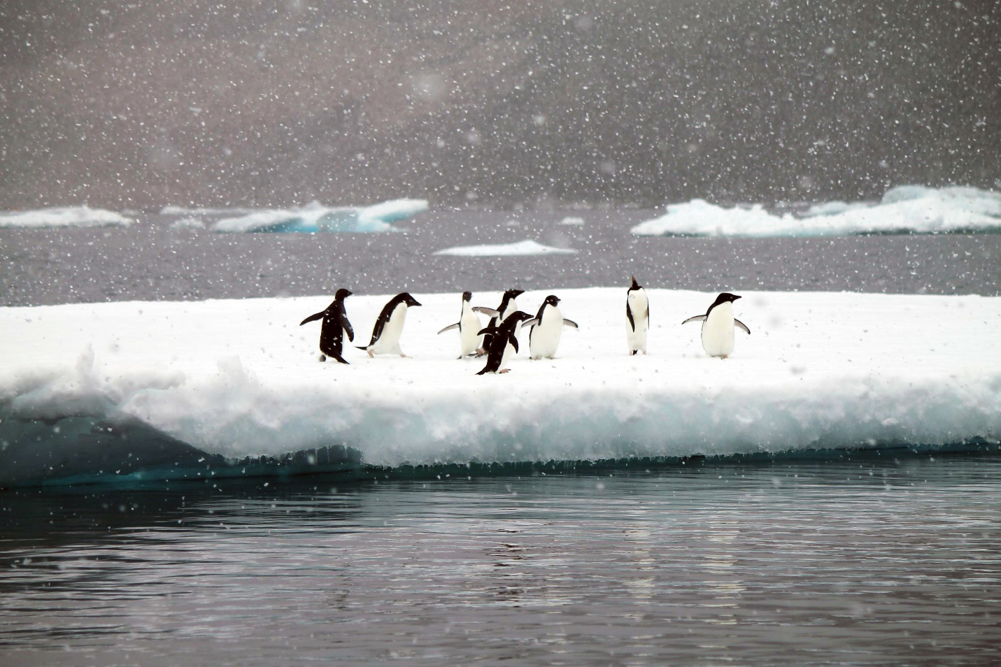 Penguins in the falling snow