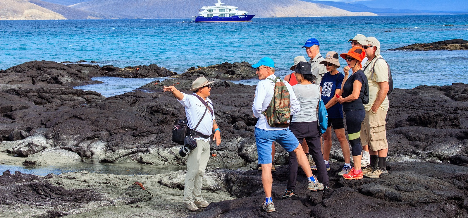 Galapagos islands, Ecuador - October 2, 2017. Tourists explore the lava fields on Bartolome island (Galapagos).