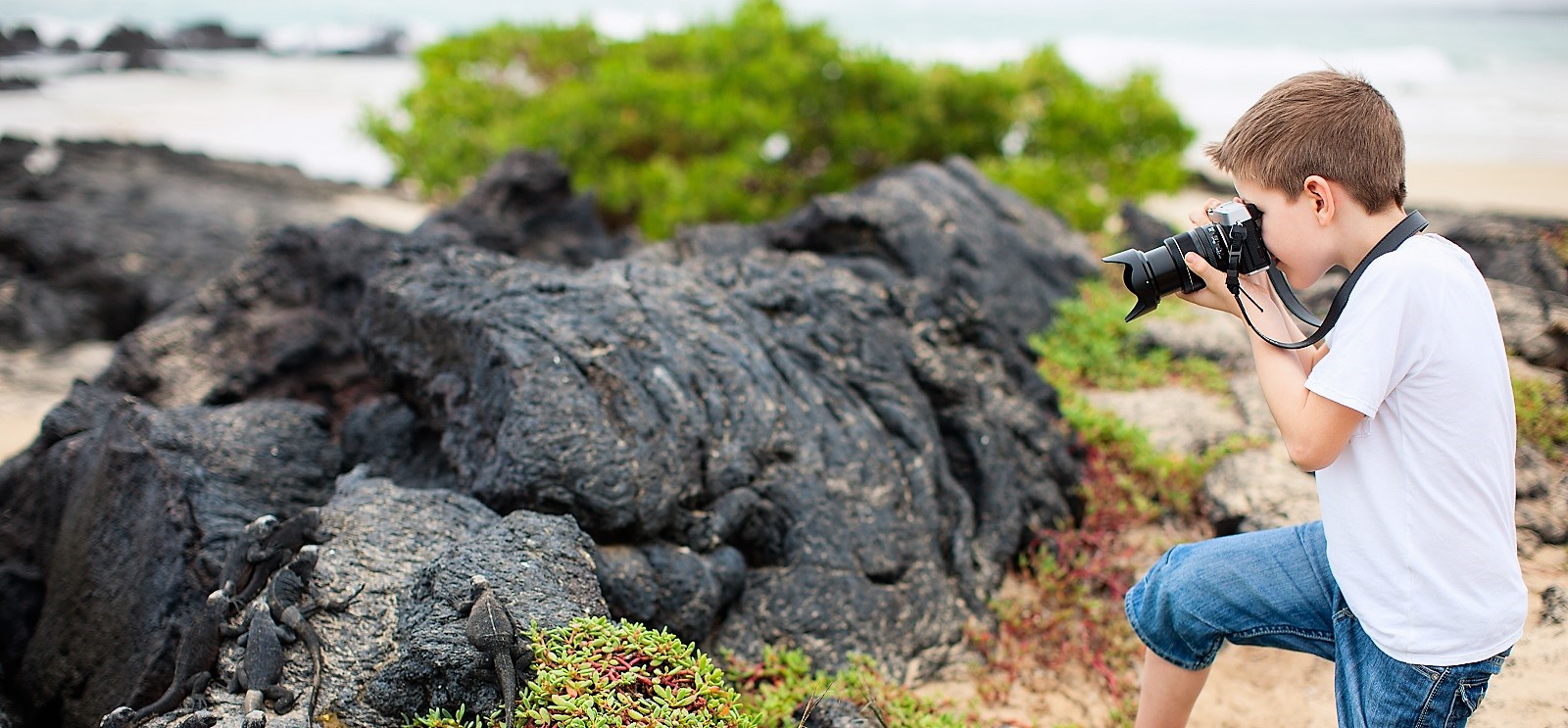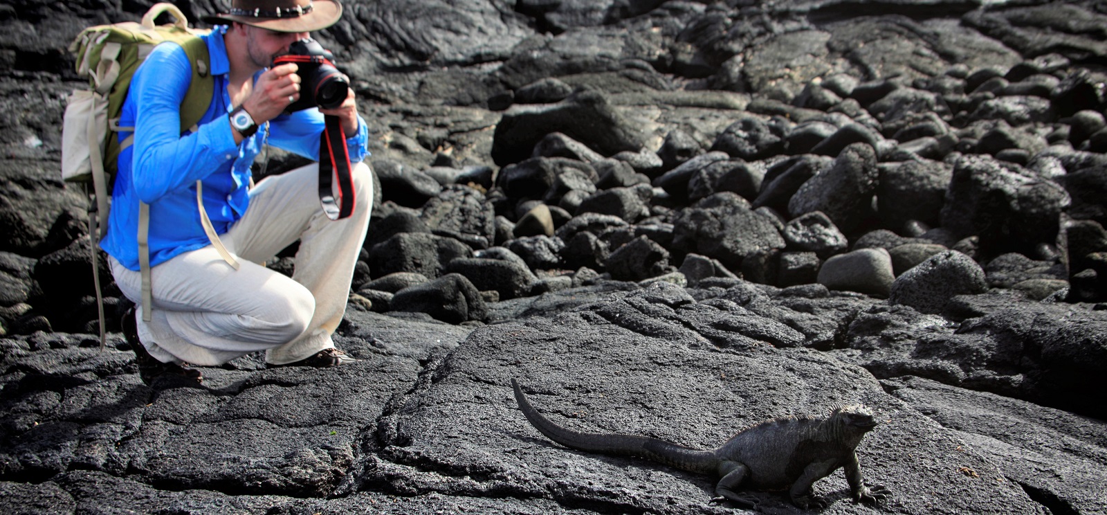 Photographer Photographing Marine Iguana on lava rock at Fernandina Island, Galapagos.