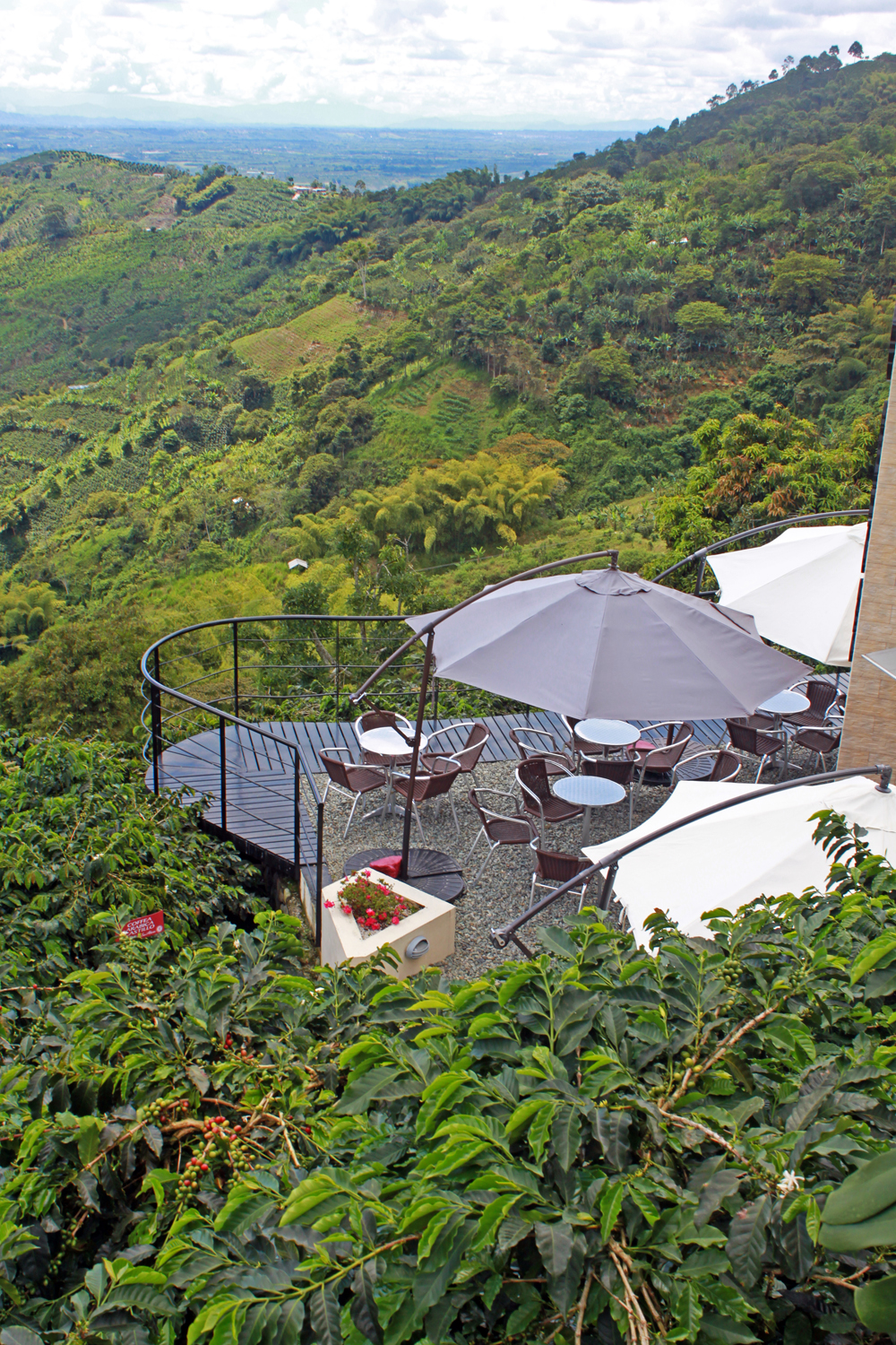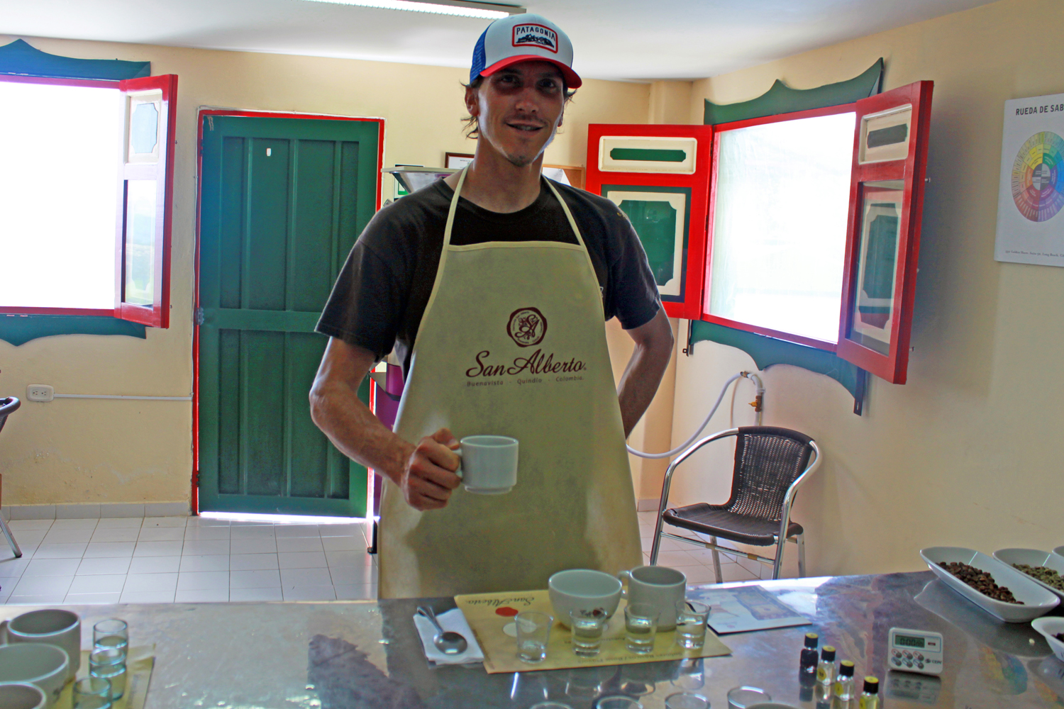 Accompanied by my Vaya colleague Jack McCabe and our wonderful guide Omar, we headed south from the Hacienda San Jose (just outside of Pereira) to the Hacienda San Alberto, located on the outskirts of Buenavista, Quindio. What a view this place has! You can enjoy a sweeping vista of the valley and mountains as you’re enjoying your tour. Here we met a young man with an obvious passion for coffee, who guided us through the different stages of production from raised beds, to trees, to the picking, weighing, drying, and finally the tasting.