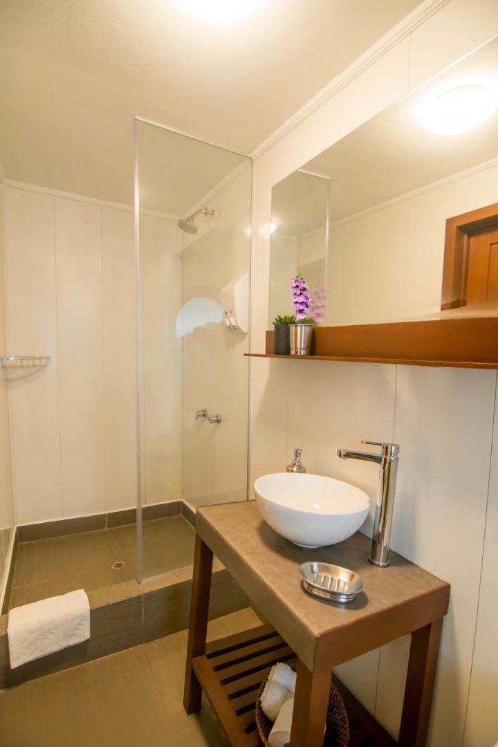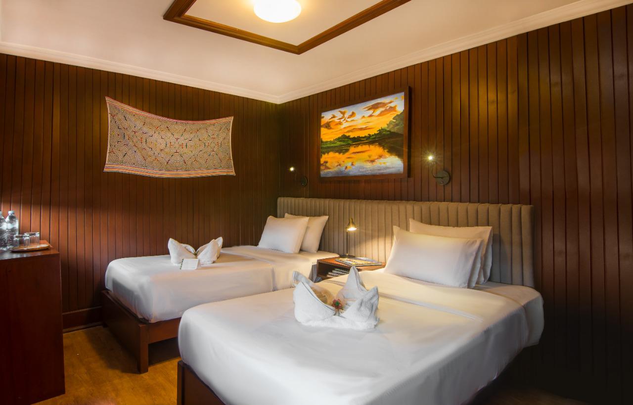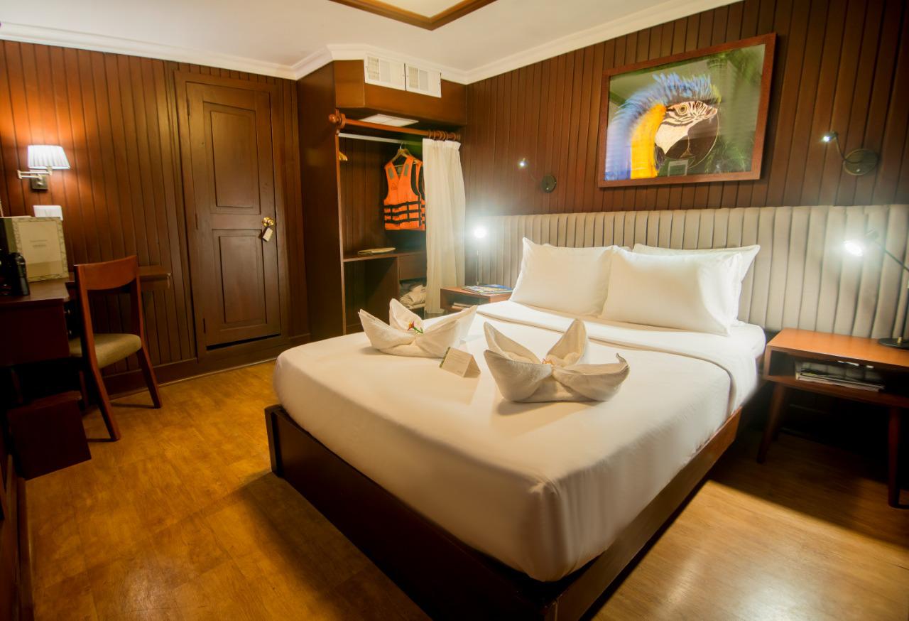 The Amatista has 15 cabins (14 double cabins and 1 triple cabin). All cabins have exterior view windows, air conditioning, and private bathrooms. The cabins are 170 square feet (16 square meters) with two twin beds or one queen bed. They are equipped with a desk, wardrobe, dresser, and hairdryer. The vessel can accommodate a total of 31 passengers.