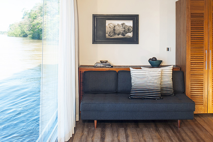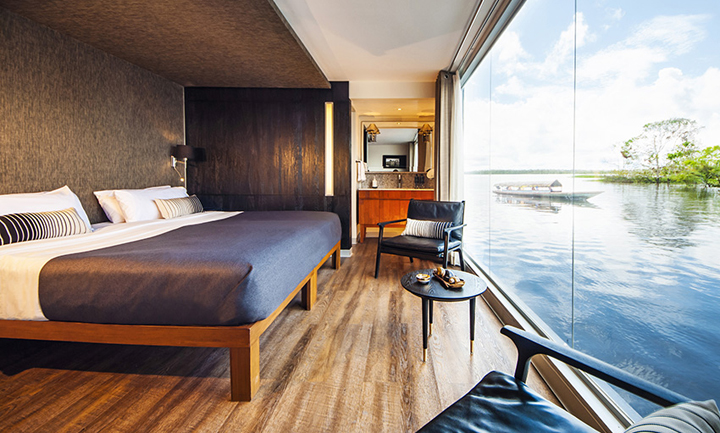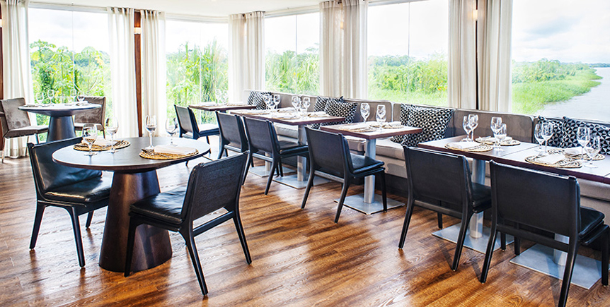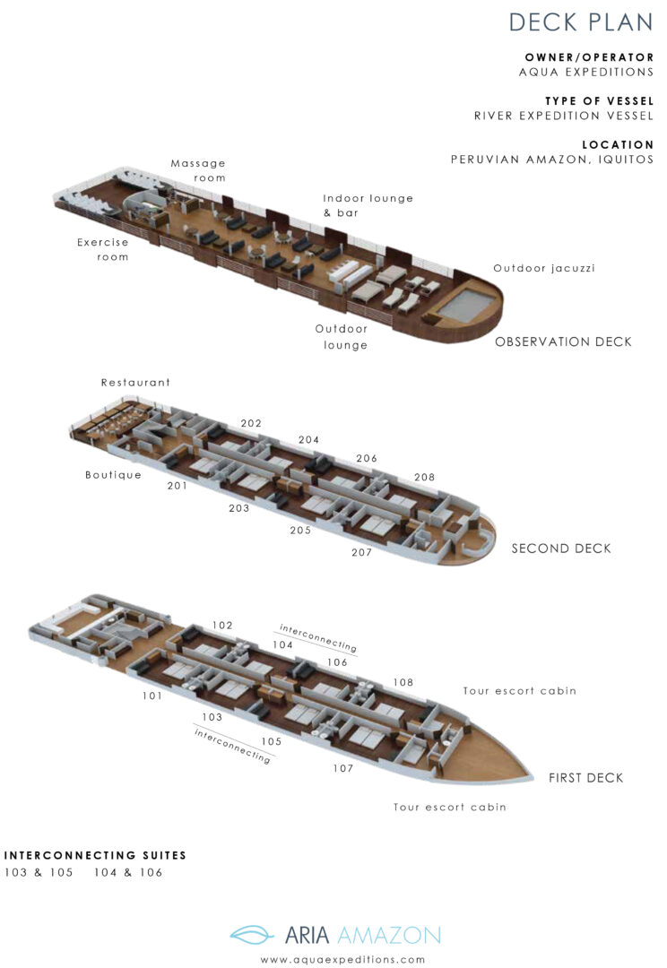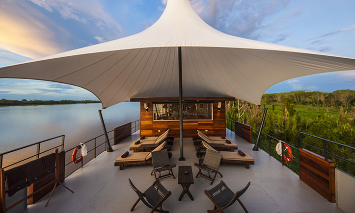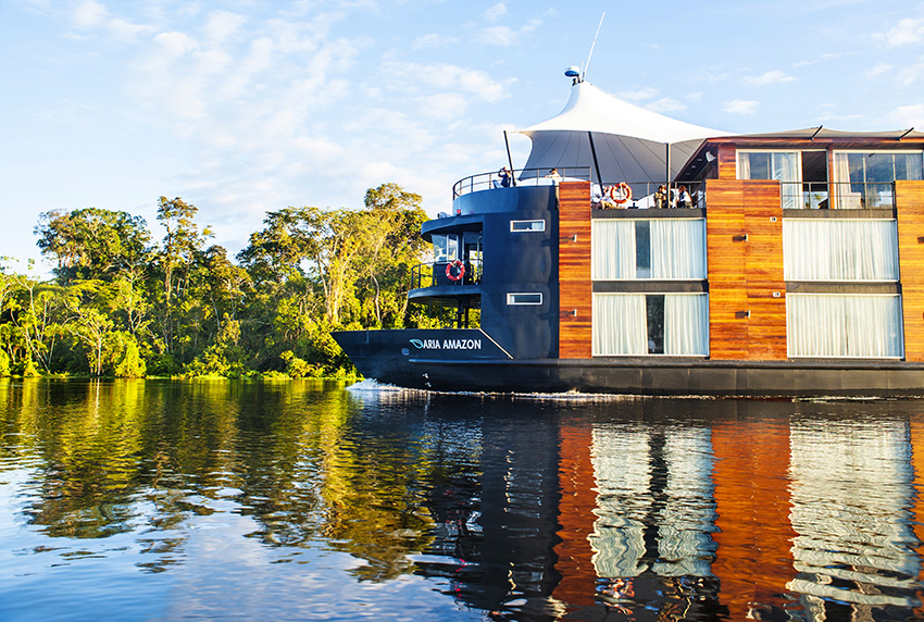 Aria Amazon was designed for Aqua Expeditions by Peruvian Architect Jordi Puig. Aria Amazon offers luxury cruise expeditions on the Amazon river. The 147-foot-long cruise ship has 16 air-conditioned suites with floor-to-ceiling windows, accommodating a maximum of 32 passengers. Amenities include an indoor lounge, an outdoor lounge with Jacuzzi, an observation deck, a massage and exercise room, and a dining area featuring gourmet Peruvian cuisine.