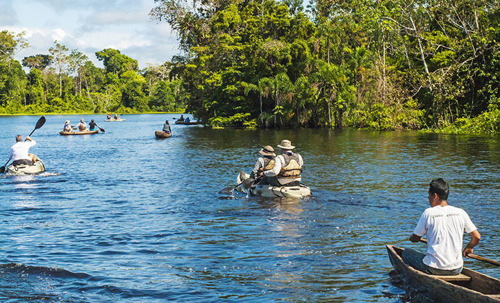 Begin the day’s adventures near the main entrance of Pacaya Samiria National Reserve, cruising along Yanayacu Pucate in the comfort of private skiffs. Here, fish for Amazonia’s notoriously ferocious piranhas while keeping an eye out for other exotic wildlife. Visit an Amazon village and witness a demonstration of aguaje palm harvesting. Kayak, canoe, and swim in the area’s enchanting black waters, all while staying on the lookout for the legendary pink dolphins. After lunch, take a jungle walk in Casual’s Forest and look for flora and fauna including medicinal trees, insects, and poison dart frogs.