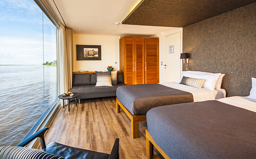8 First Deck Suites, 250 square feet 8 Second Deck Suites, 250 square feet All suites have twin beds that can be converted to a king-sized bed. All suites have private bathrooms, air conditioning, river-facing panoramic windows, and en suite sitting area.