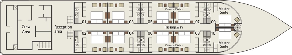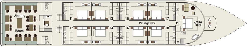 The Zafiro has 19 suites in total comprising of 16 standard suites, 2 master suites, and 1 Zafiro suite. All cabins have air conditioning, private bathrooms, hair dryer, safe, mini fridge, and binoculars.