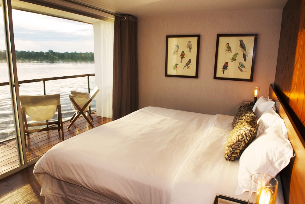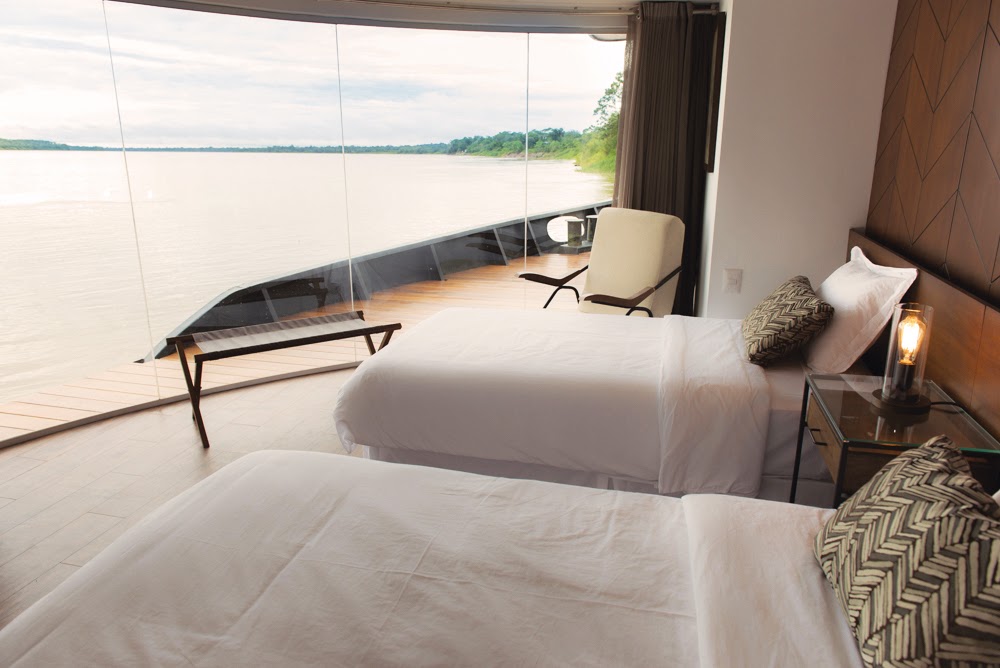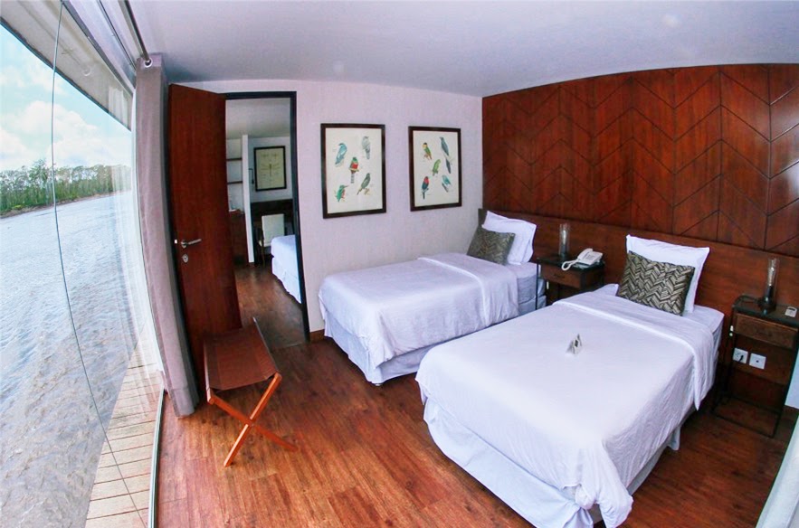Suites: 226.04 ft² (21 m²) – Panoramic view with floor to ceiling windows, 8 with private balcony overlooking the Amazon River. 4 interconnected suites ideal for families.
