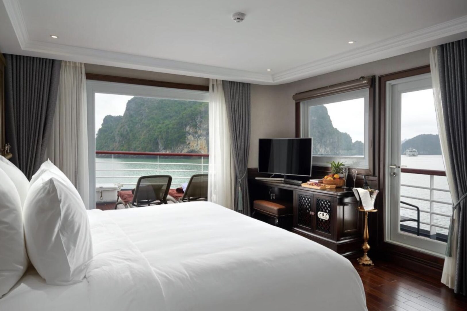 The Paradise Grand’s 39 cabins are shared across four types: Grand Balcony, Executive Grand Balcony, Grand Balcony Suite, and Captain’s View Grand Suite. Each one has been crafted to perfection, with elegant interior design, complimentary tones, and en-suite bathrooms with shower (and bath in the suites). A highlight of the Paradise Grand cabins are the attached private outdoor spaces. Unlike most cruise ships in Lan Ha Bay, all cabins on the Paradise Grand offer balconies or terraces, lending a private slice of Lan Ha Bay.