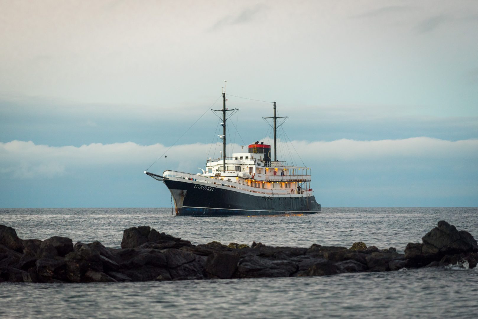 The Evolution yacht is a 32-passenger luxury vessel, 192 feet long. It has the atmosphere of one of the smaller yachts in the islands, while providing some additional space. The decks and social areas are spacious and well-appointed. Guides, food, and service are of top quality. An excellent way to see the Galapagos, combining the best of small yacht cruising and comfort.