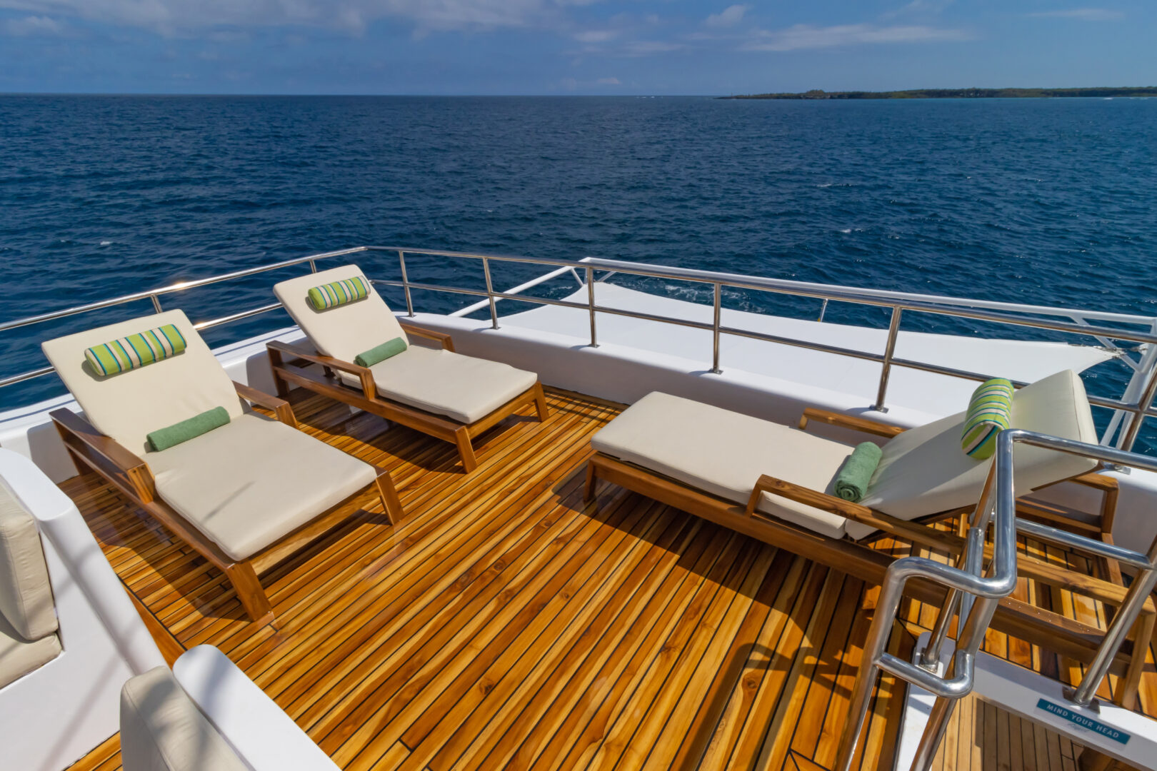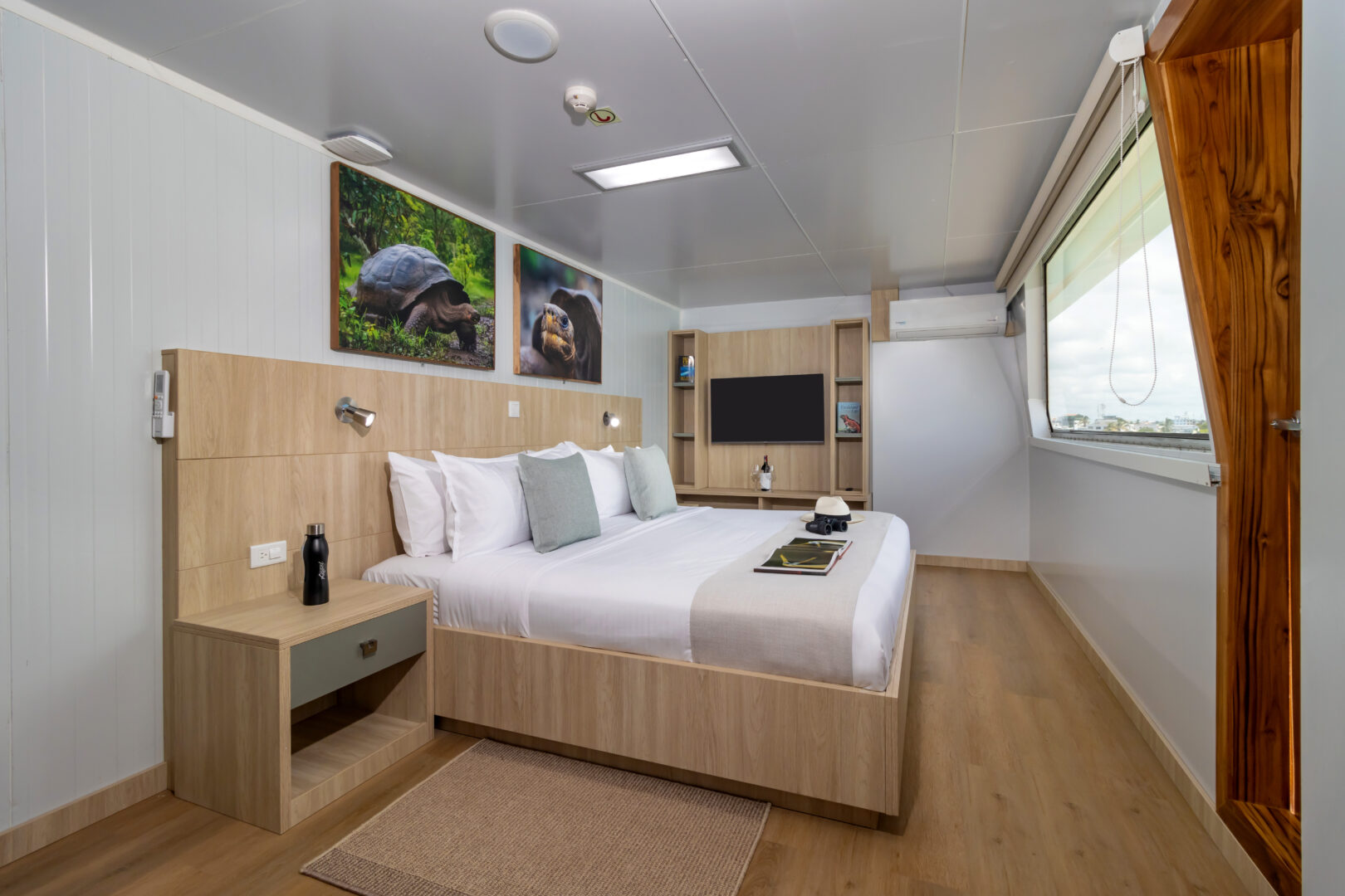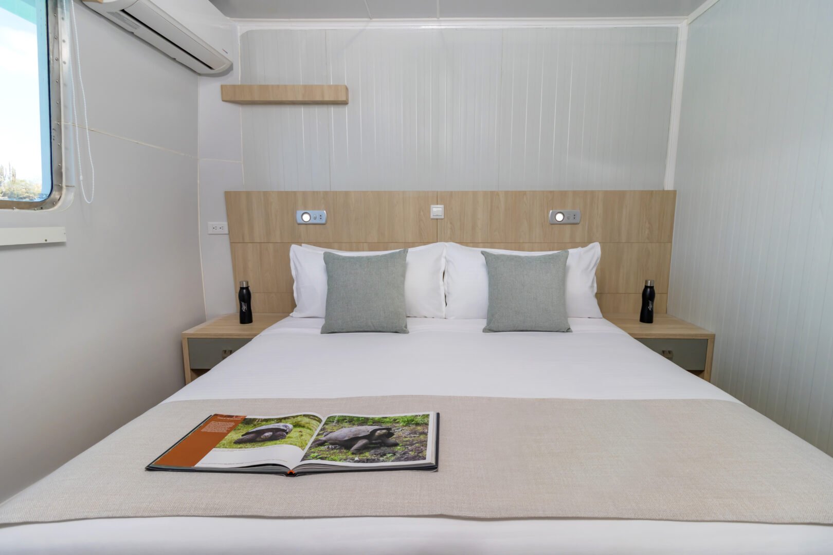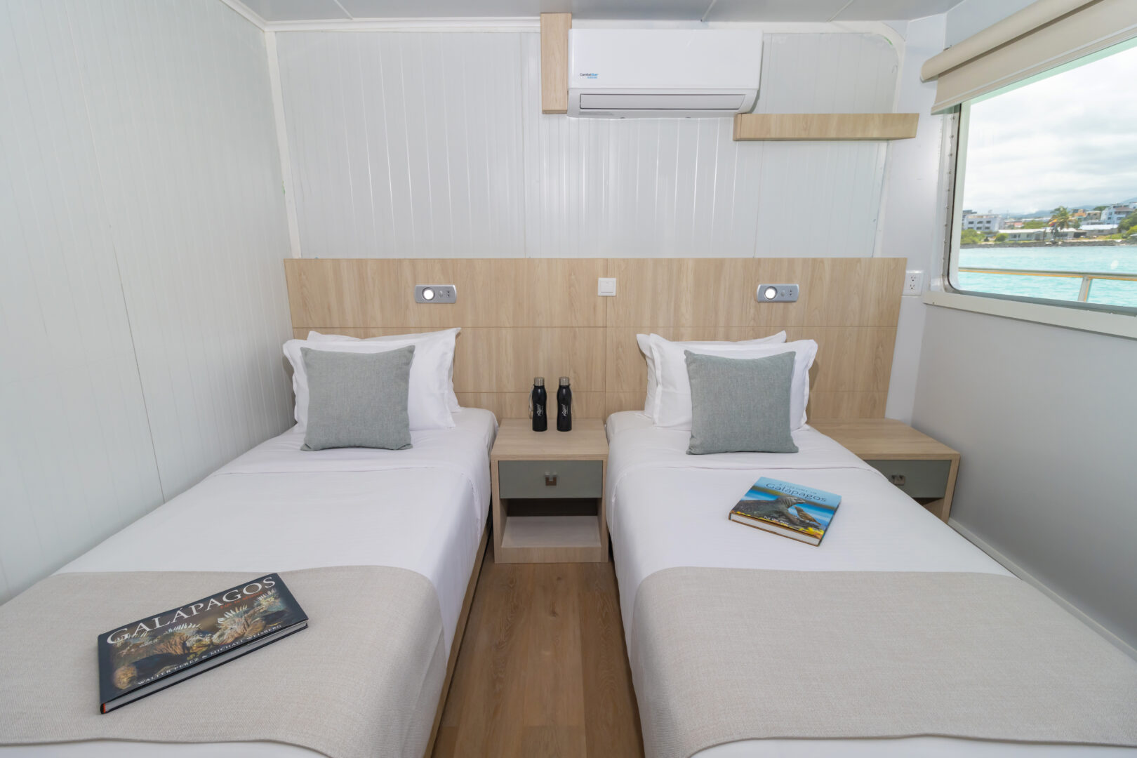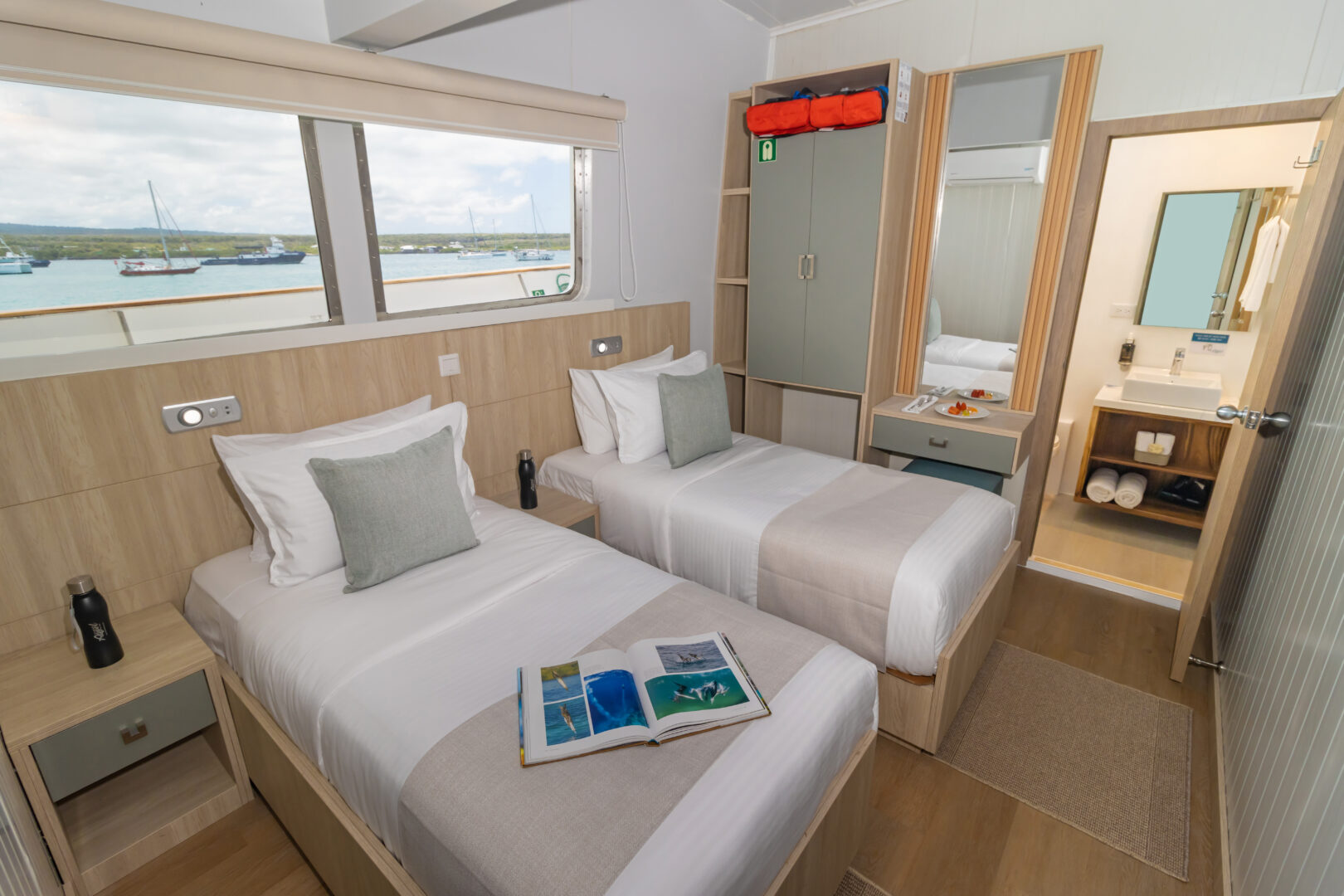 The Galapagos Angel has a passenger capacity of 16 guests, allowing for a feeling of intimacy and exclusive service. There are two spacious suites as well as six convertible ensuite cabins, all featuring panoramic views and air-conditioning.