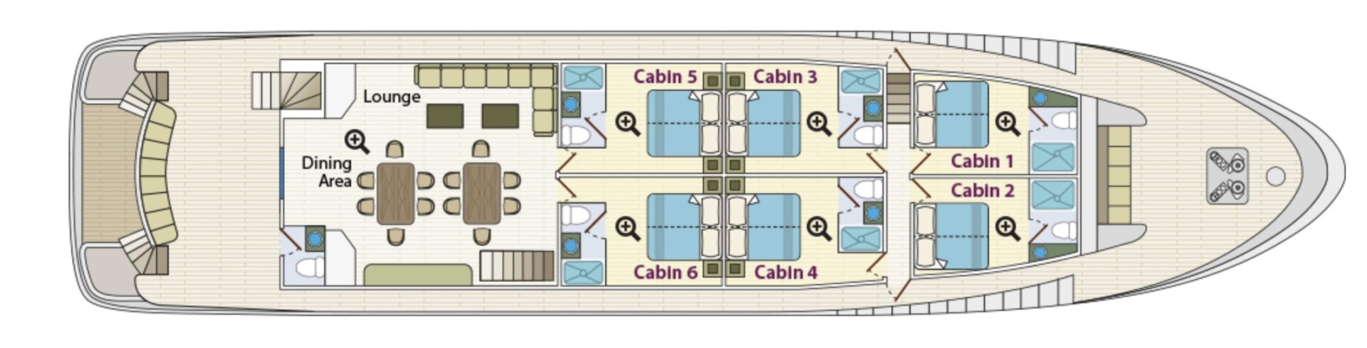 Max number of passengers: 16, in 6 cabins and 2 suites