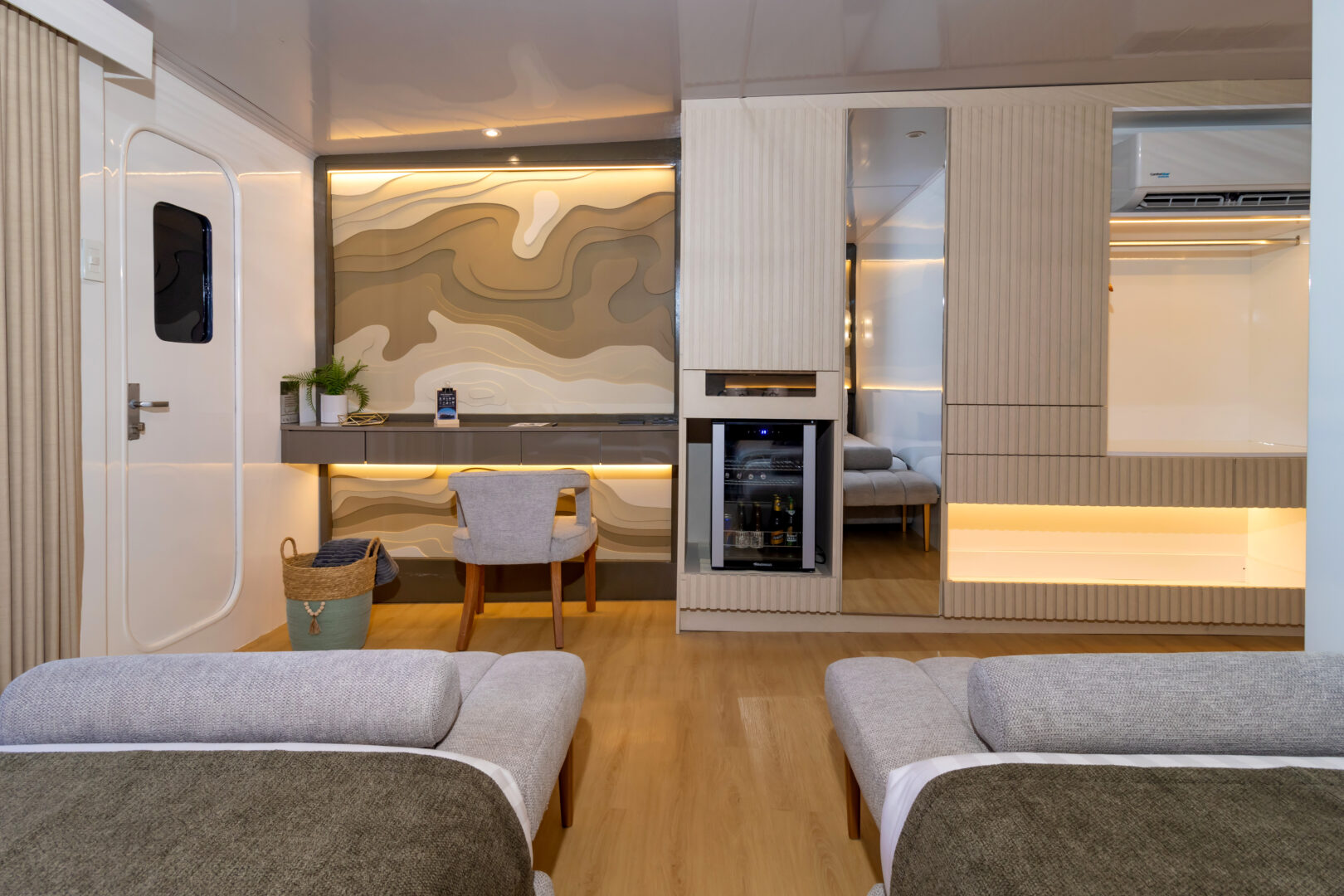 Groups & Charters: This yacht is also available for private charter or for small groups of friends or family. Its 9 cabins can accommodate up to 16 people. Inquire for more details.