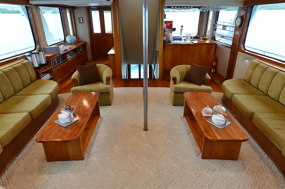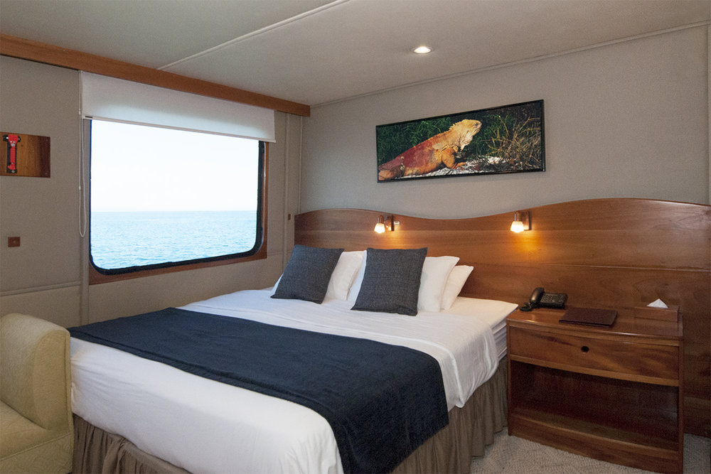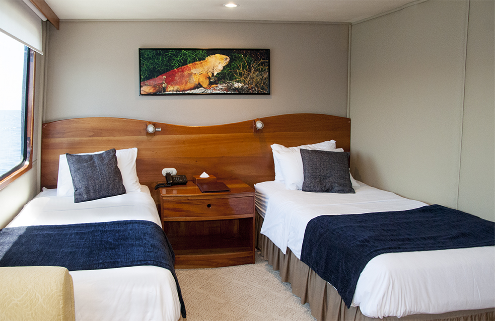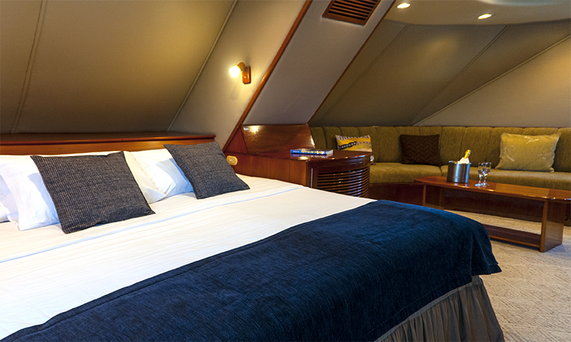 The Integrity has 5 double cabins with convertible king/twin beds (150 sq. ft.), 1 double cabin with queen bed (150 sq. ft.), 1 double cabin with twin beds (150 sq. ft.), 1 single cabin (120 sq. ft.) and 1 Owner’s suite cabin (350 sq. ft.), all on the Stateroom Deck.