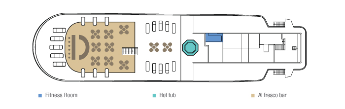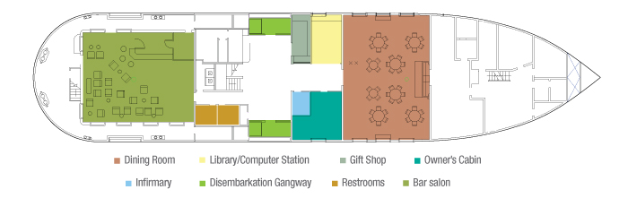 Construction: refurbished in 2000 Type: Deluxe Motor Yacht Length: 166 ft. / 54 mts. Beam: 38 ft. / 12 mts. Engines: 2 x GM Detroit Diesel 900 BHP Speed: 10 knots Accommodations: 1 Master Cabin, 18 Classic Cabins, and 1 Standard Cabin, all with private facilities Crew: Captain, 3 Bilingual Naturalist Guides, Medical Officer, plus 23 crew members