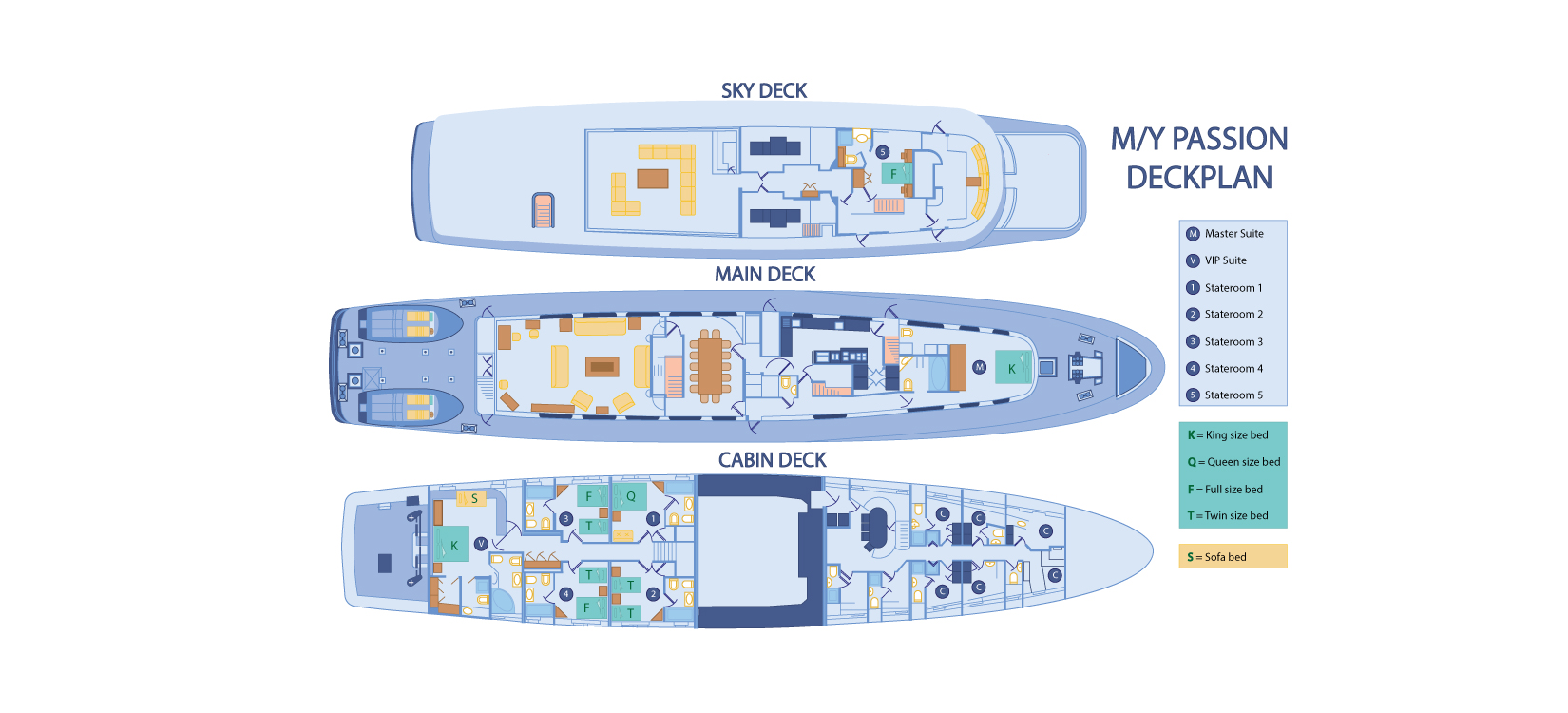 The Passion has 1 Master Suite with King bed, 1 VIP Suite with King bed, 1 Stateroom with Queen bed, 1 Stateroom with Twin beds, 2 Staterooms with 1 Full and 1 Twin bed each, and 1 Stateroom with Full bed. All cabins have private facilities.