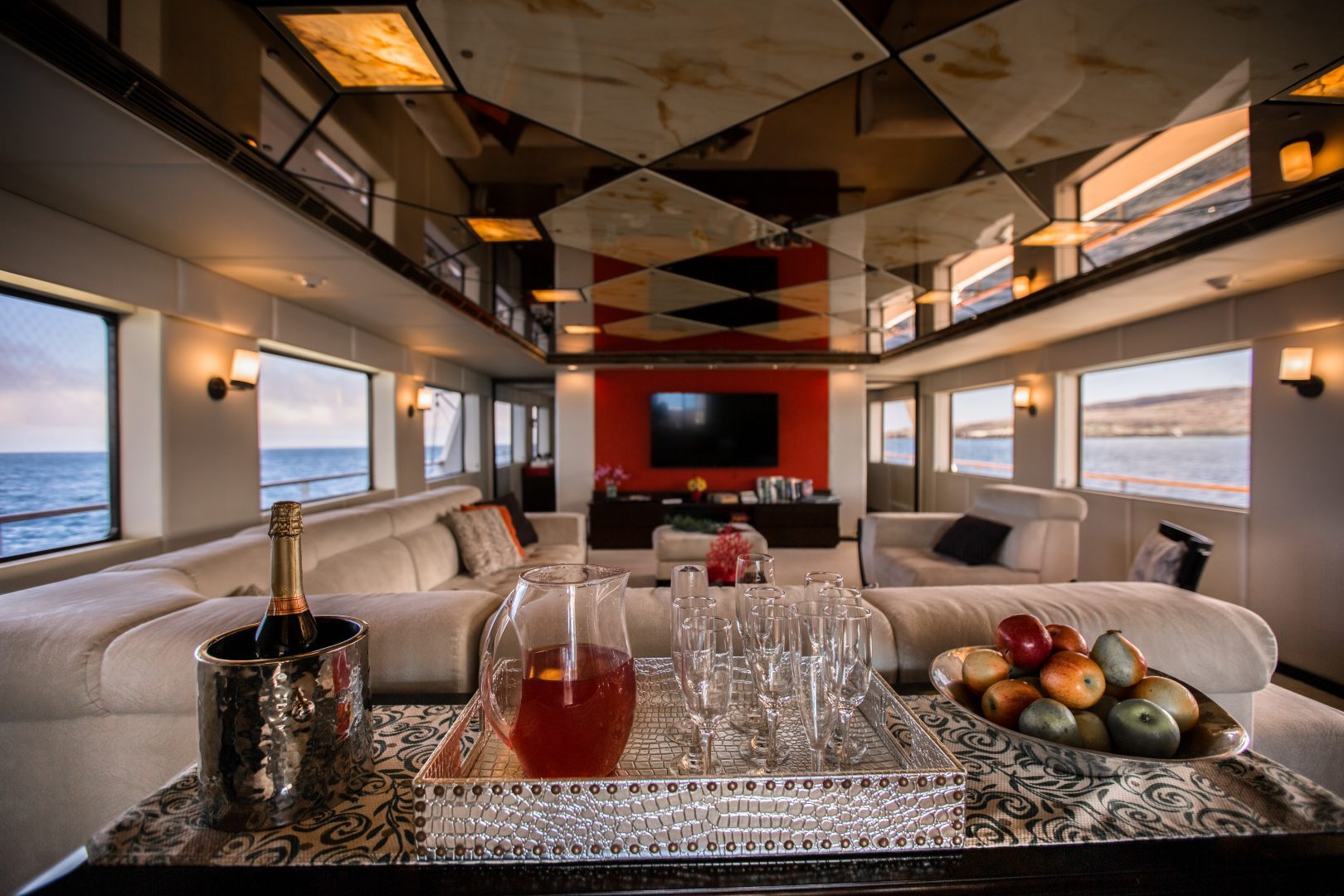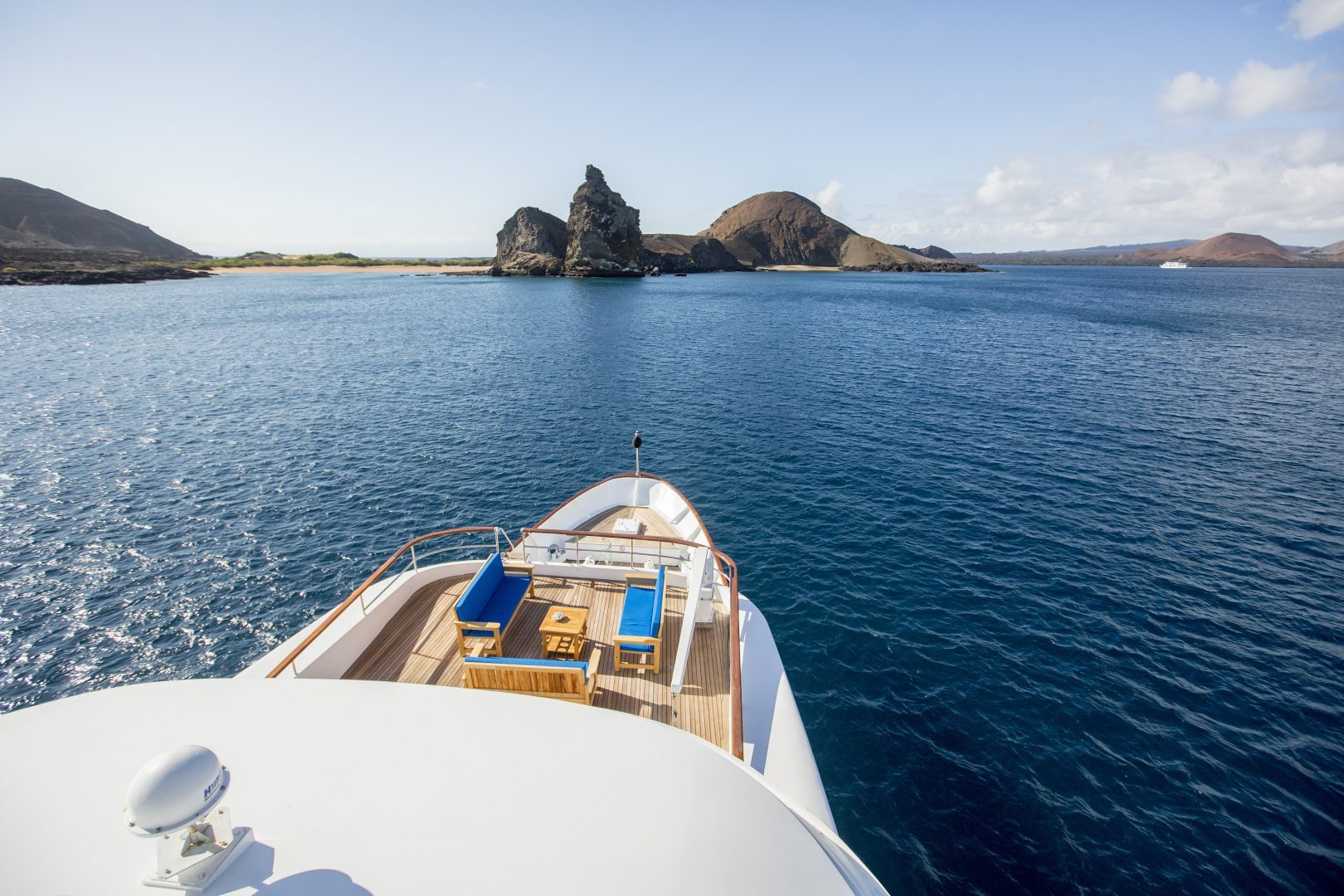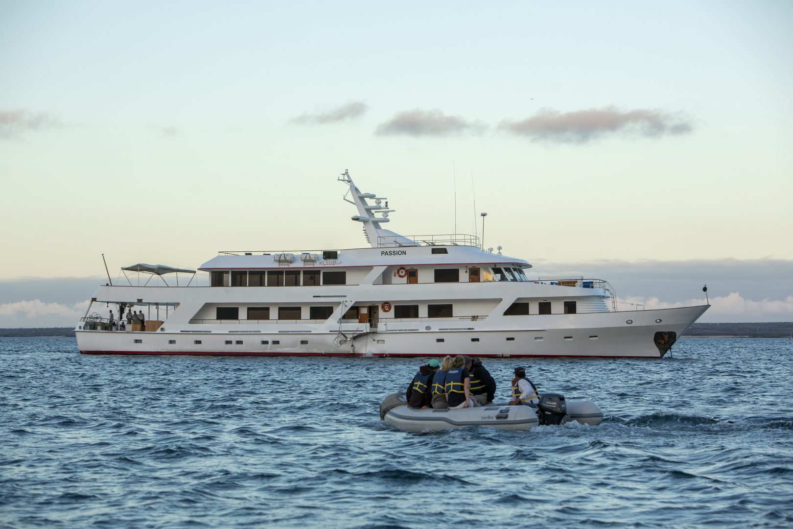 The Passion, Galapagos' luxurious triple-deck motor yacht, features ample interior and exterior social areas, a panoramic sky lounge with bar and sliding glass doors, a separate dining room, and wonderfully spacious decks, including a sun deck with lounge chairs and a Jacuzzi. The Passion accommodates up to 14 guests in its five spacious staterooms and two suites, each with air conditioning and a marble en suite bathroom. With a crew of 12+, this elegant vessel offers a 1-to-1 service ratio for a very personalized experience. All excursions are done in the company of a bilingual naturalist guide. Activities available on the Passion include hiking, snorkeling, and kayaking.
