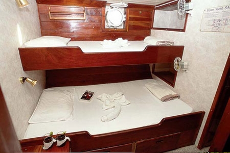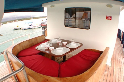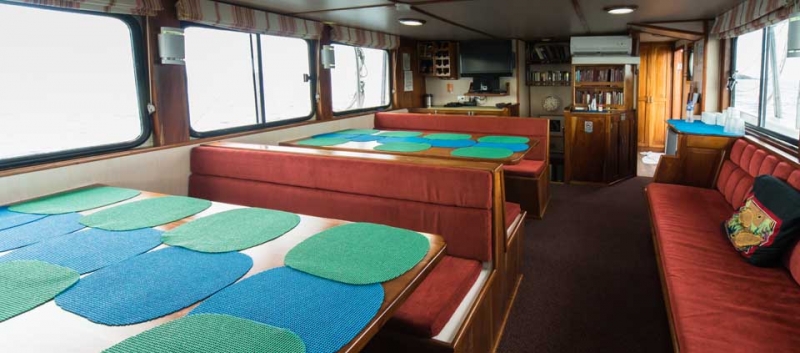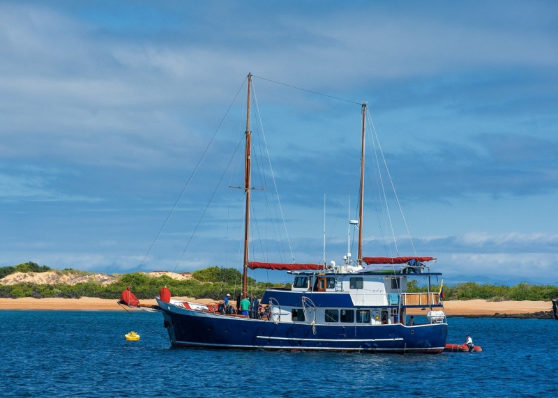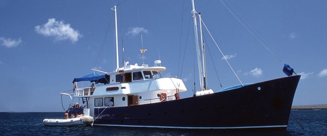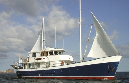 Construction: completed in 1966 Type: Steel-hulled motor yacht with stabilizing sail Length: 78 ft. / 23.77 mts. Beam: 18 ft. / 5.48 mts. Engines: Twin DAV diesel engines 220 HP Accommodations: 6 air-conditioned double cabins and 1 exterior double bed cabin, each with private bathroom Crew: Captain, mechanic, cook, 1 naturalist guide, plus 3 crew members