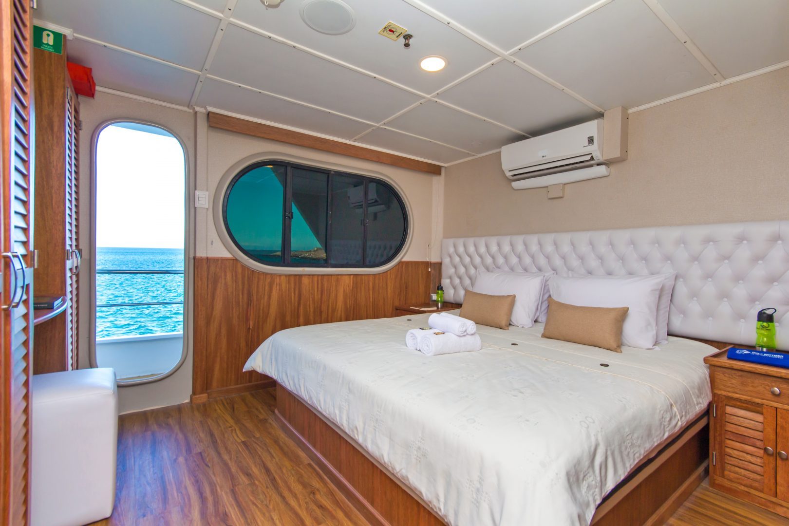 There are 4 Upper Deck cabins. Two are with two twin beds (cabins 7 & 8) and two are with one king size bed (cabins 9 & 10). The 4 Upper Deck Cabins feature a private balcony.