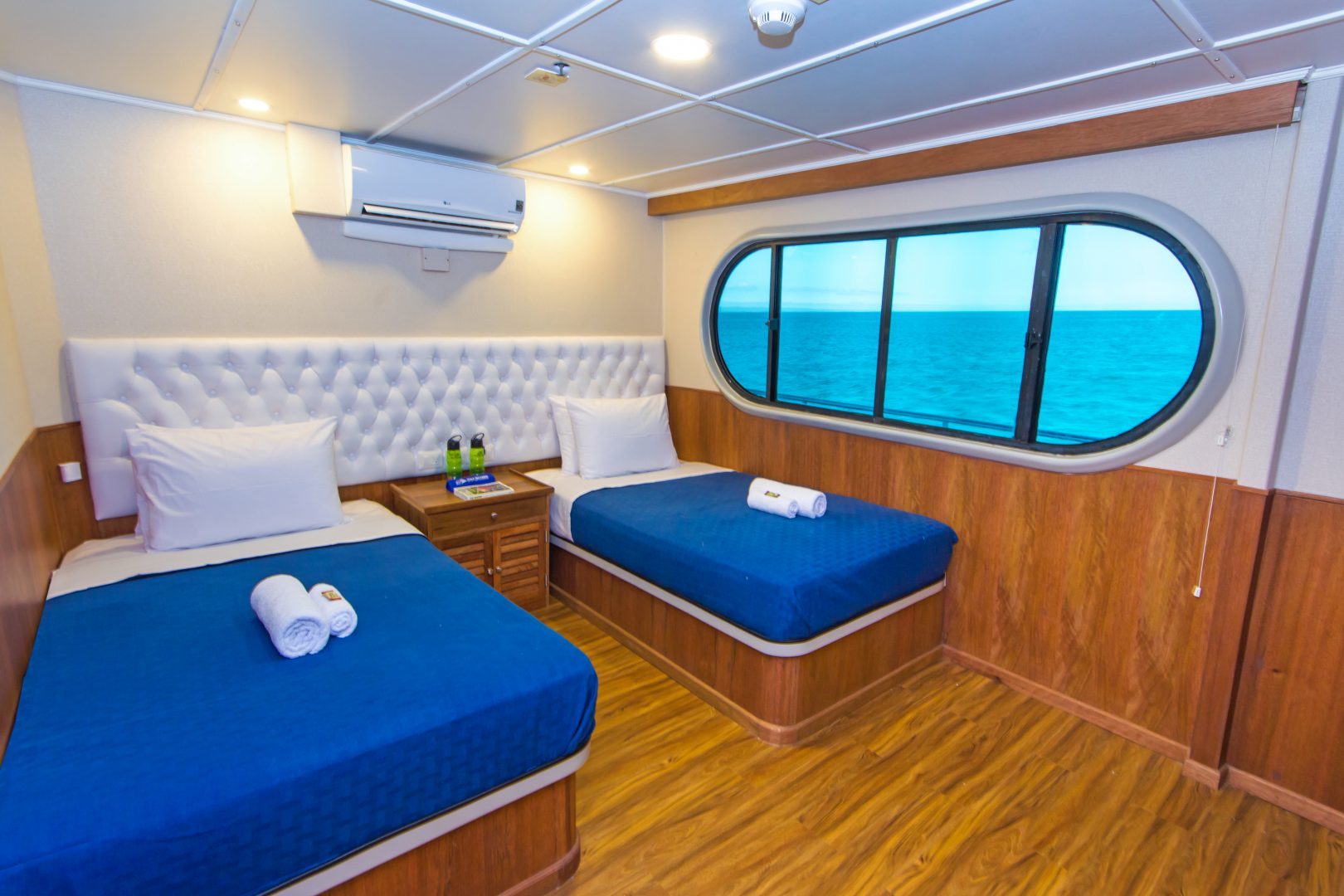 There are 6 Main Deck cabins. Two cabins are with one full-size bed (cabins 1 & 2) and the other four are with two twin beds (cabins 3 to 6).