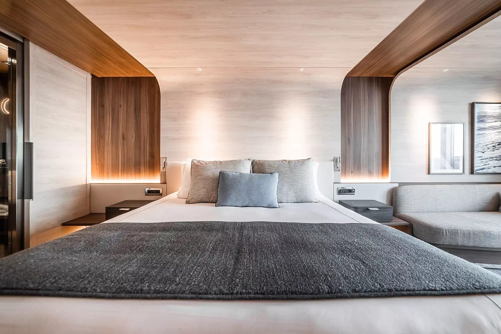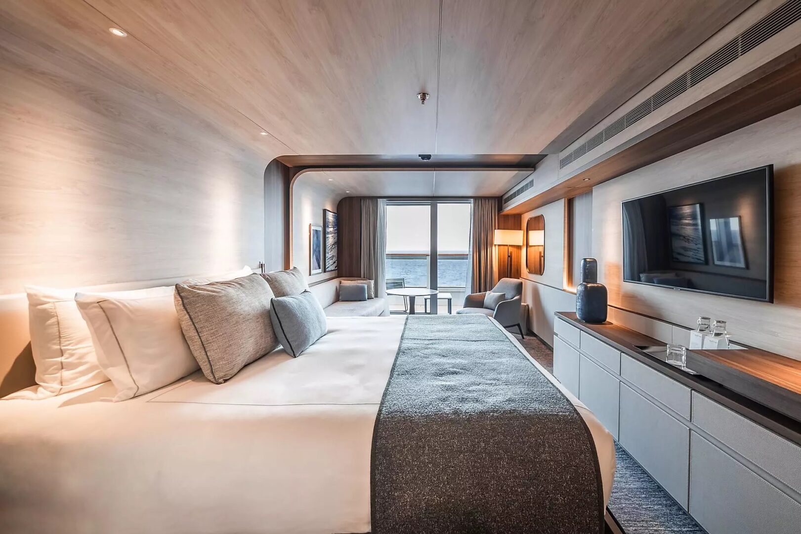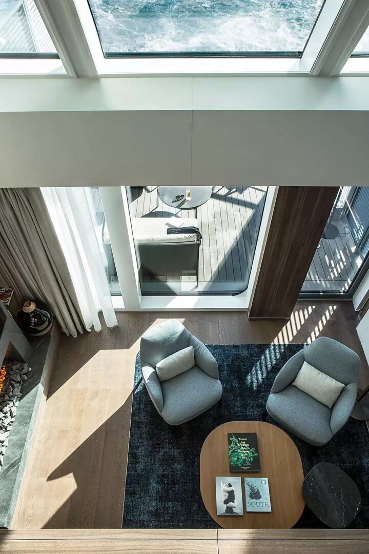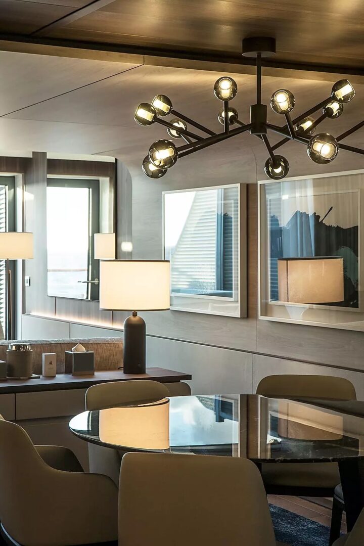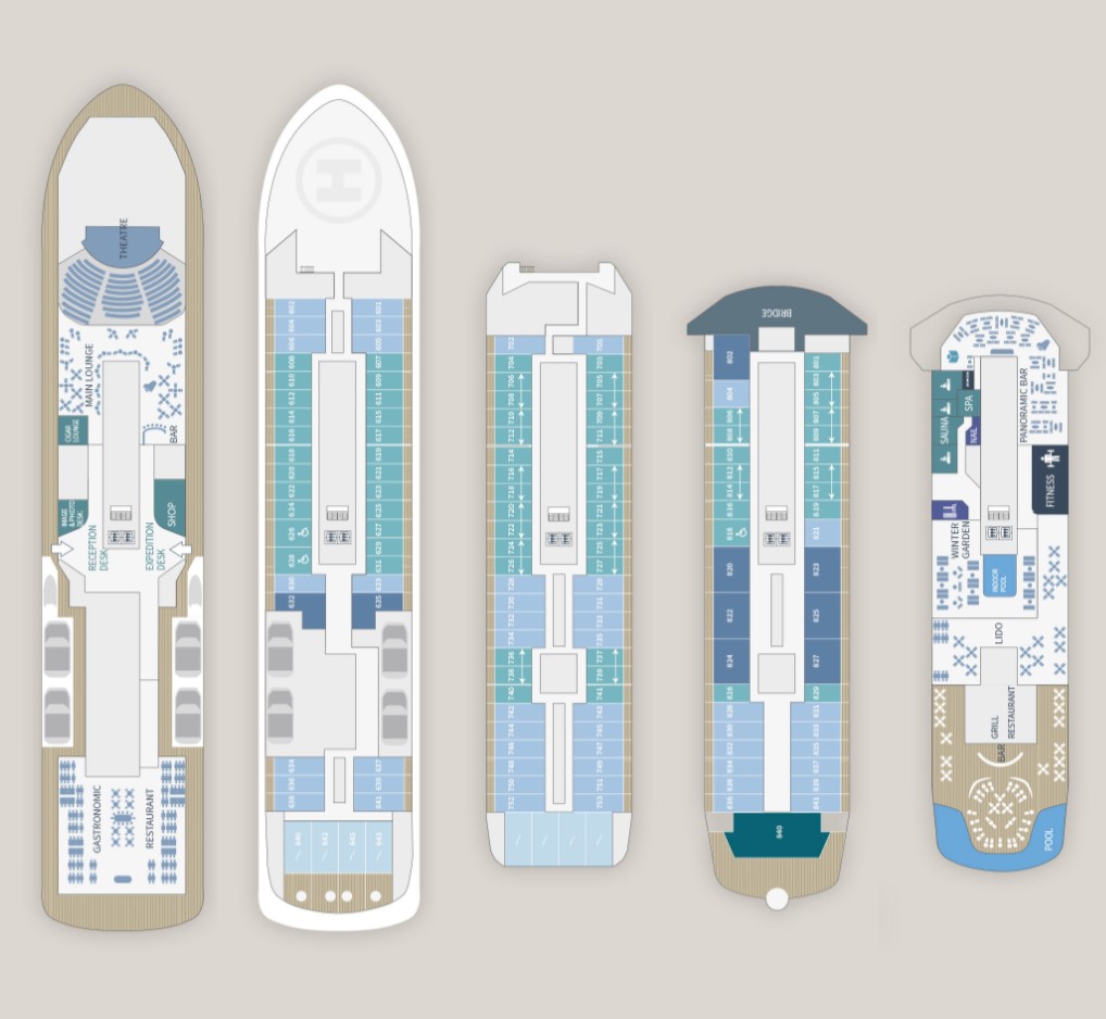 This superb mega-yacht with 135 cabins and suites was designed in France and built in Norway. The indoor swimming pool, the conservatory, the panoramic restaurant, the Blue Lagoon outdoor restaurant, the Main Lounge, the Observation Lounge, the lobby… Each of the common areas has been designed to both convey French-style discreet luxury and arouse wonder and amazement. The common thread running through all their designs is the desire to allow the light to penetrate and open everything up the extraordinary polar landscapes and scenery. This very first hybrid-electric polar exploration ship powered by LNG has been designed with the greatest attention to detail in terms of safety and respect for the environment.