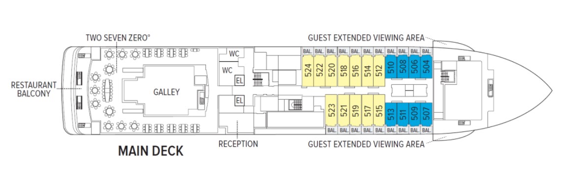 • Category 3 (Main Deck—Standard Balcony cabin with balcony and sofa, 205 square ft. #512-524)