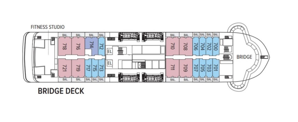 • Category 5 (Bridge Deck—Standard Balcony cabin with balcony and sofa, 205 square ft. #708, 709, 711, 713)