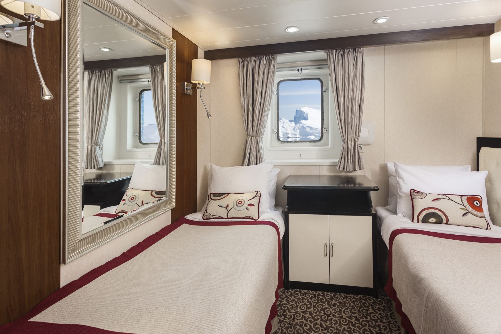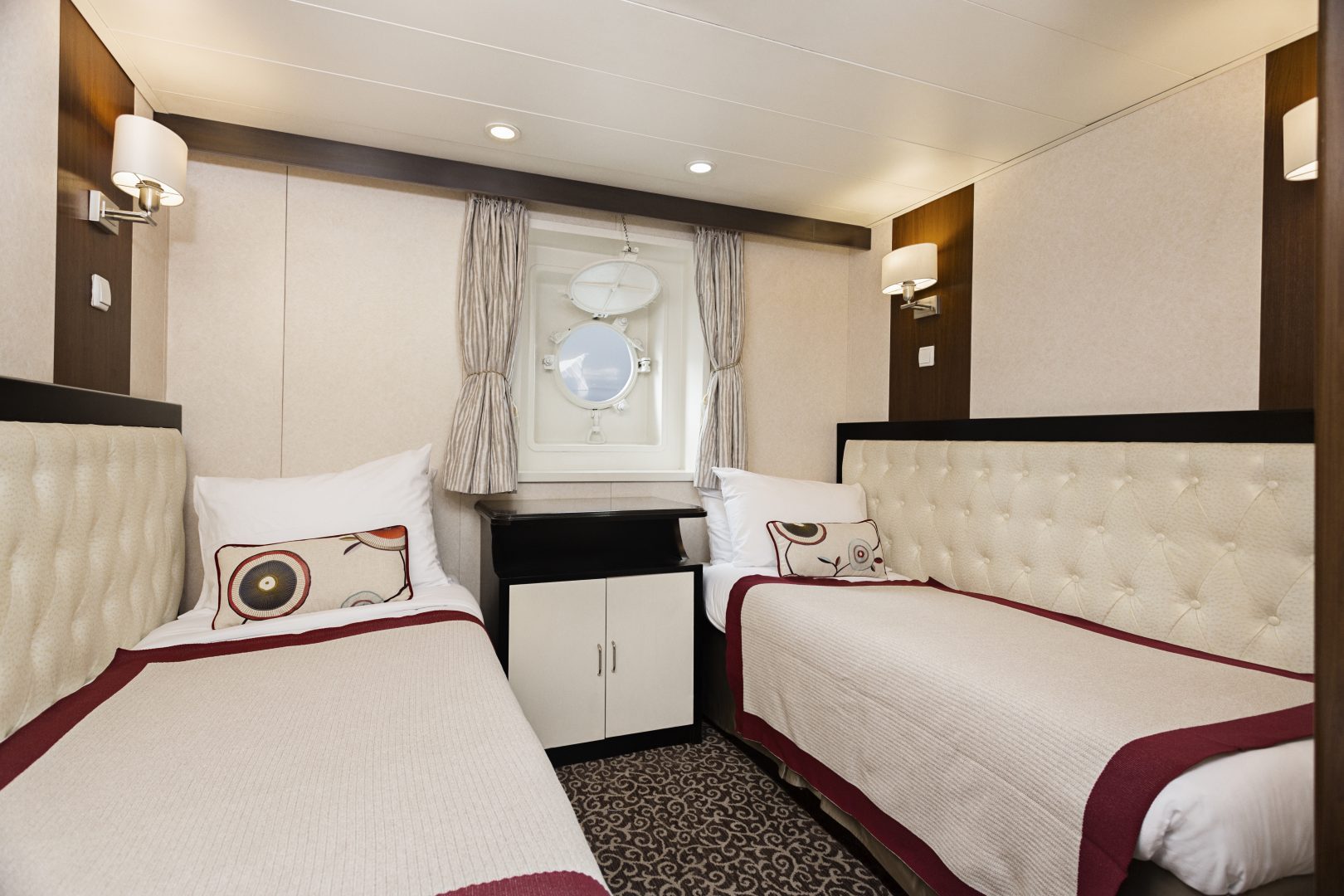 Category C (12-13 m2) – This Standard Cabin has two single beds, private bathroom, and a window. Located on Marco Polo Deck (Deck 5).