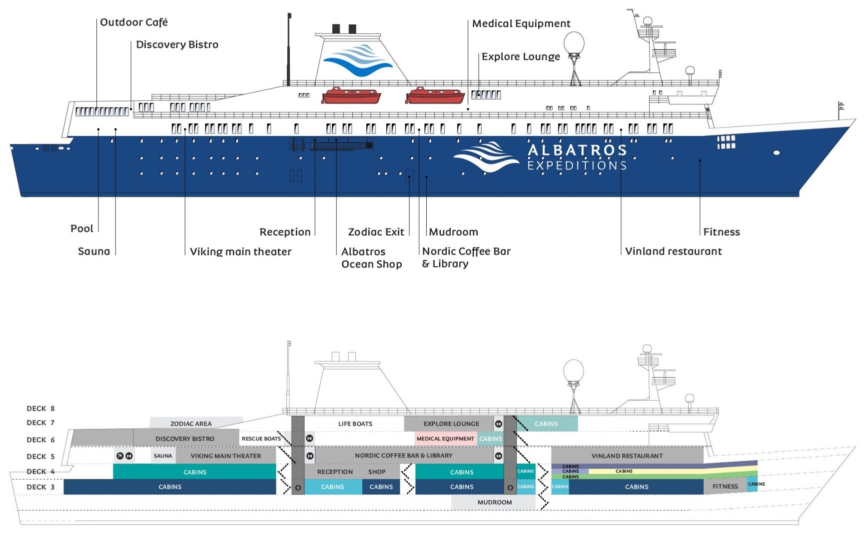 Staff & Crew: 140 Passengers: 200 Length: 459 feet (140 meters) Width: 69 feet (21 meters) Draft: 19 feet (5.8 meters) Engines: 4 x 3,600 kW Ice class: 1B Cruising speed: 12 knots Max speed: 15 knots Zodiacs: 20