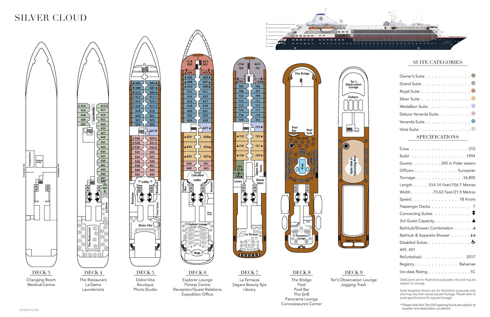 Staff & Crew: 212 Guests: 254 Length: 133 ft. Width: 58 ft. Draft: 13.5 ft. Tonnage: 16800 Max Speed: 14 knots Class: Lloyd's 1C Refurbished: 2017