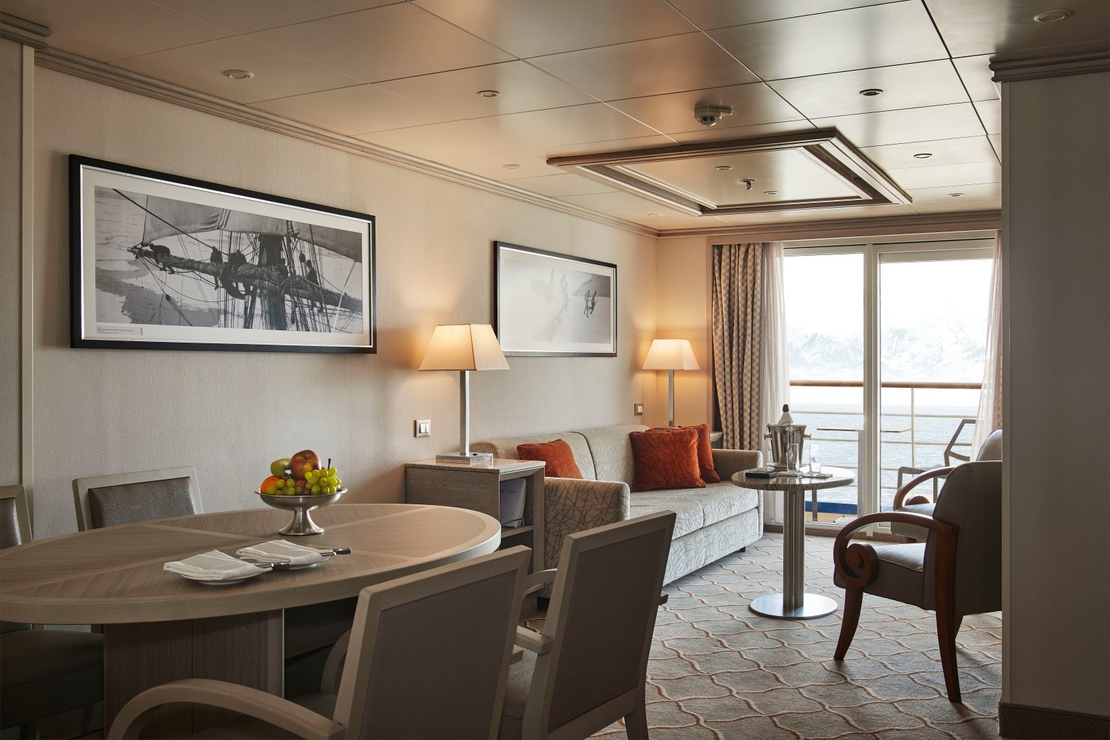 Classic Veranda Suite – A Silversea signature, the Classic Veranda Suite is also spacious and welcoming with floor-to-ceiling glass doors that open onto a furnished private teak veranda from which you can take in spectacular sunsets in privacy. Some Classic Veranda Suites accommodate three guests (295 sq. ft. including a veranda).