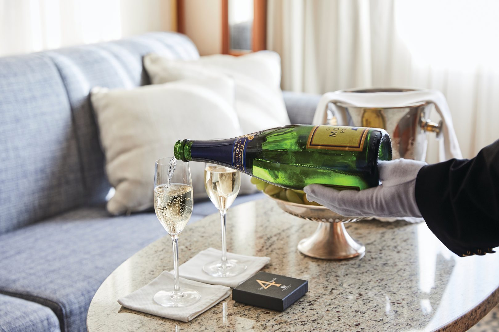 Grand Suite – Expertly designed and exquisitely appointed, the Grand Suite on the <i>Silver Wind</i> is ideal for entertaining friends or enjoying a quiet dinner “at home.” Available in a one-bedroom configuration (1,019 sq. ft. for one bedroom) or as a two-bedroom adjoining with a Veranda Suite (1,314 sq. ft. for a two-bedroom. Both have a veranda.