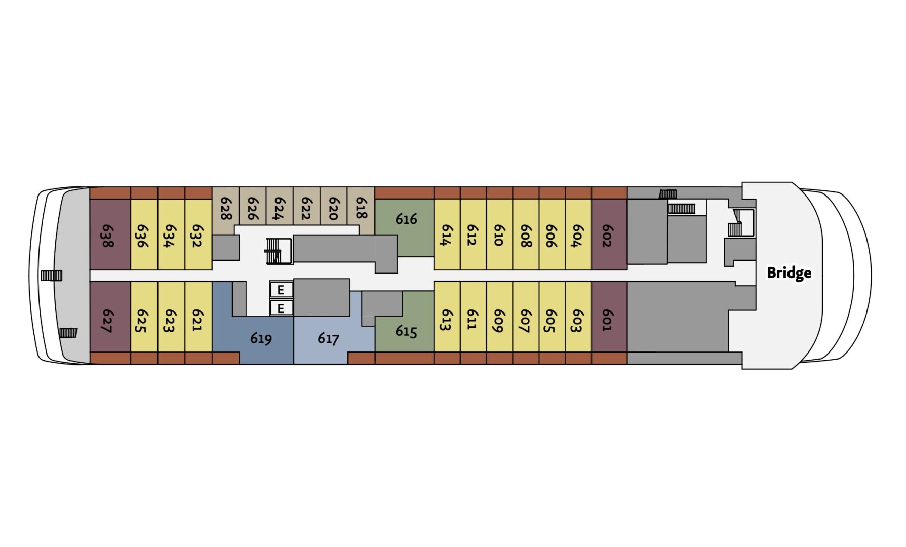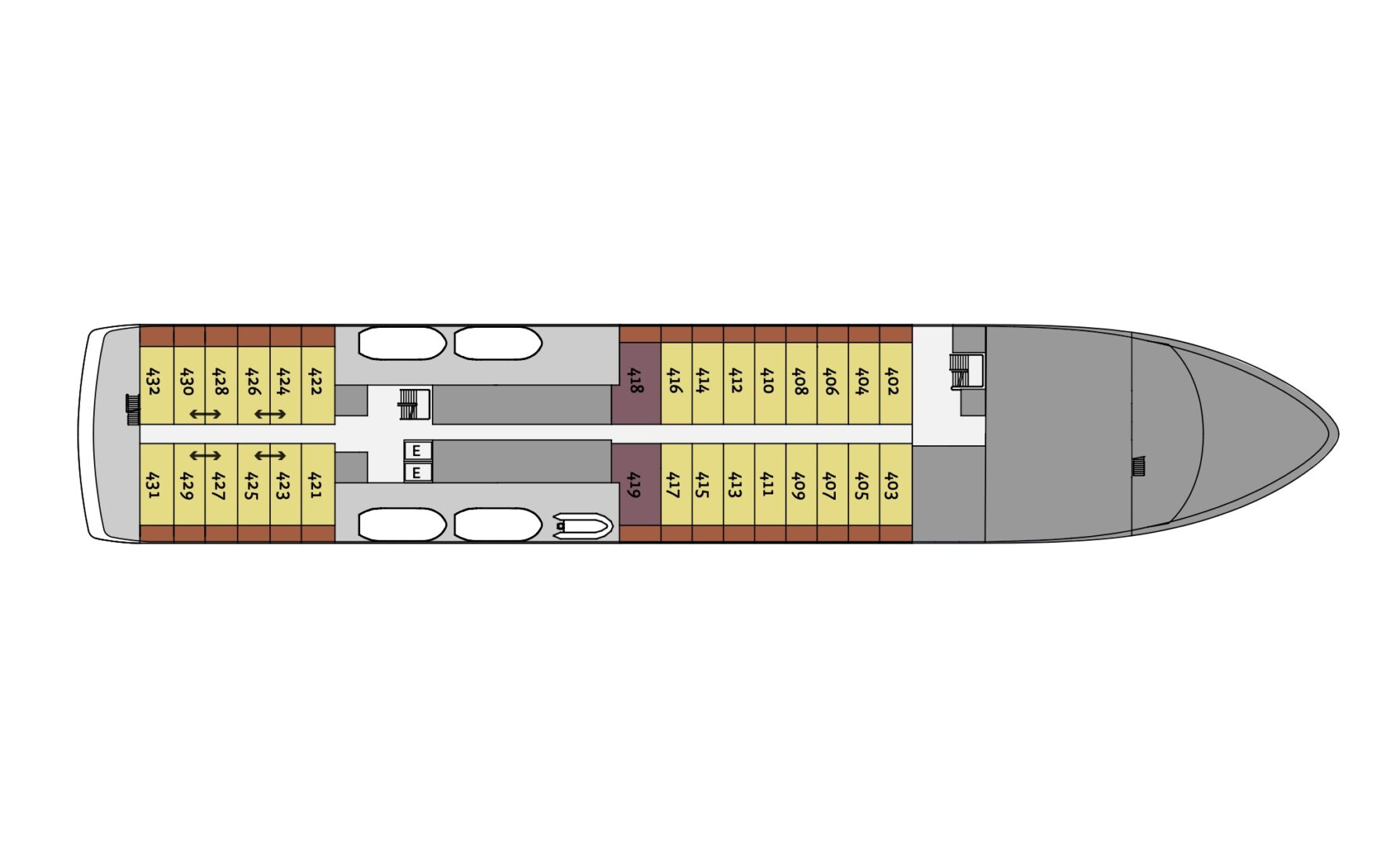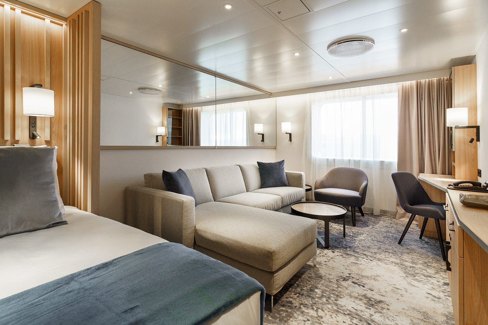 Balcony Suite: Located on Decks 4 and 6 with approximately 226 sq. ft. (21 m2) of indoor living space and a 52 sq. ft. (4.8 m2) balcony, this suite is for guests who are looking for both indoor and outdoor living spaces. There are four connecting suites in this category, making this an excellent option for families or groups wanting to stay connected to each other during their expedition.