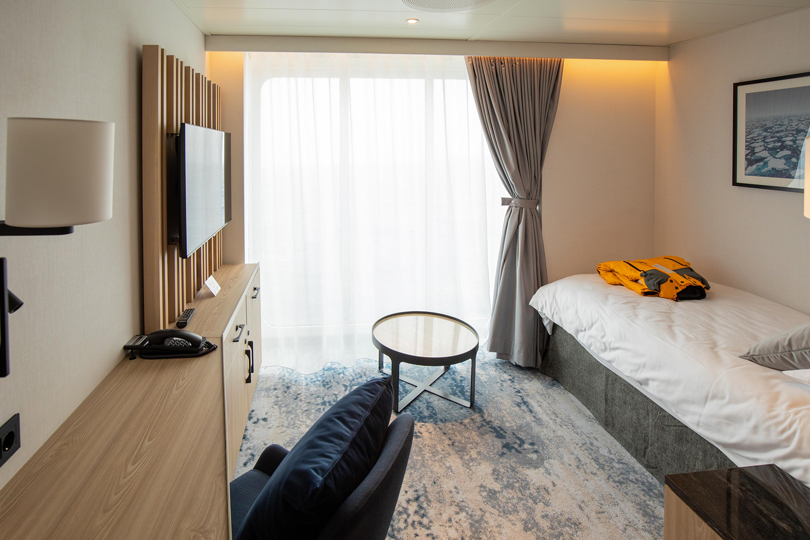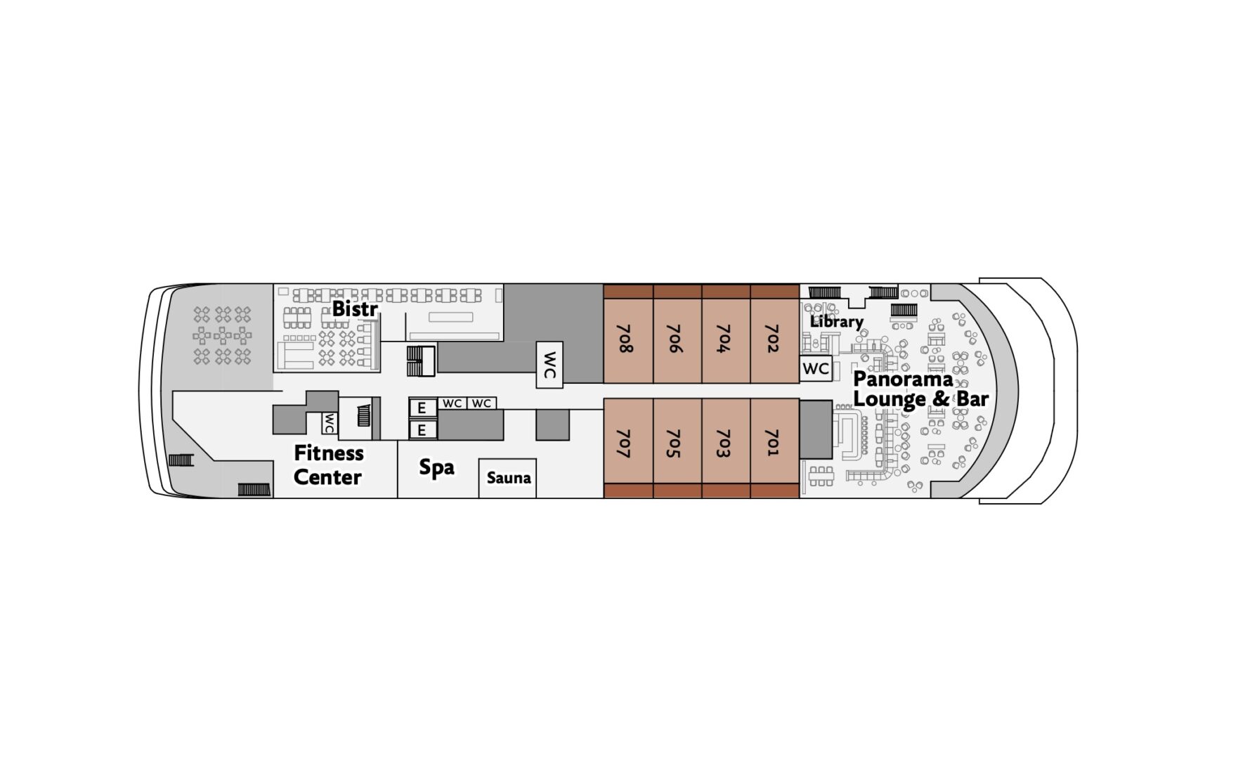 Penthouse Suite: The only suite category to be located on Deck 7, with approximately 369 sq. ft. (34.3 m2) of indoor living space and a 67 sq. ft. (6.2 m2) balcony, this suite is for guests wanting to wake up to unobstructed polar views from the warmth and comfort of their bed onboard the ship. These suites offer the best of everything—views, spacious interiors, full bathrooms, and generous balcony sizes—as well as easy access to the wellness center.